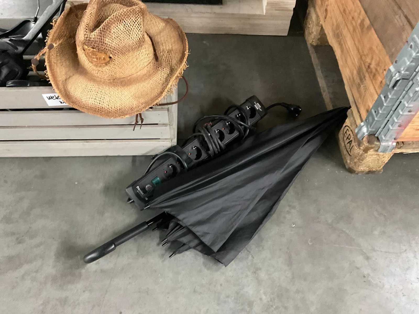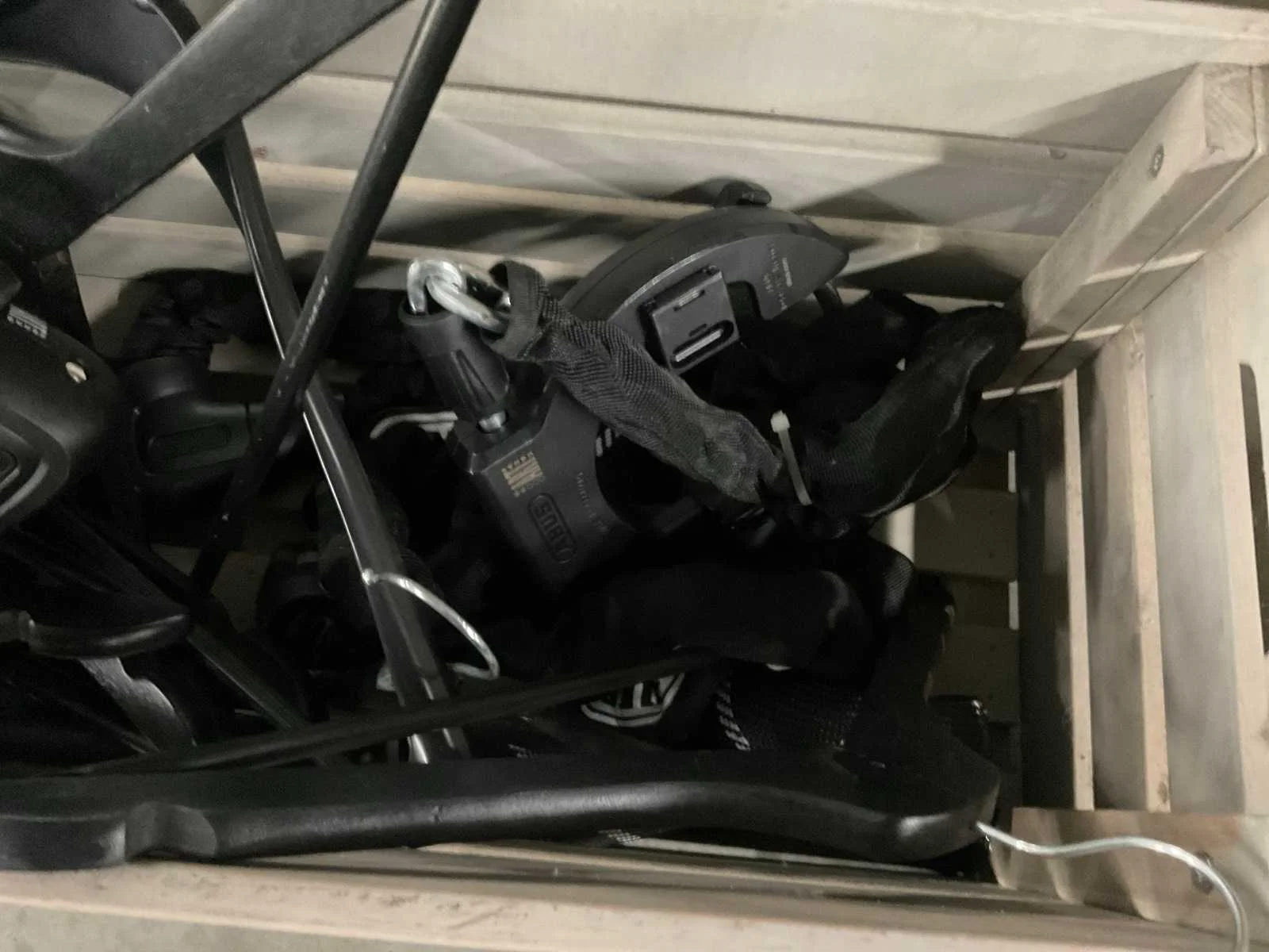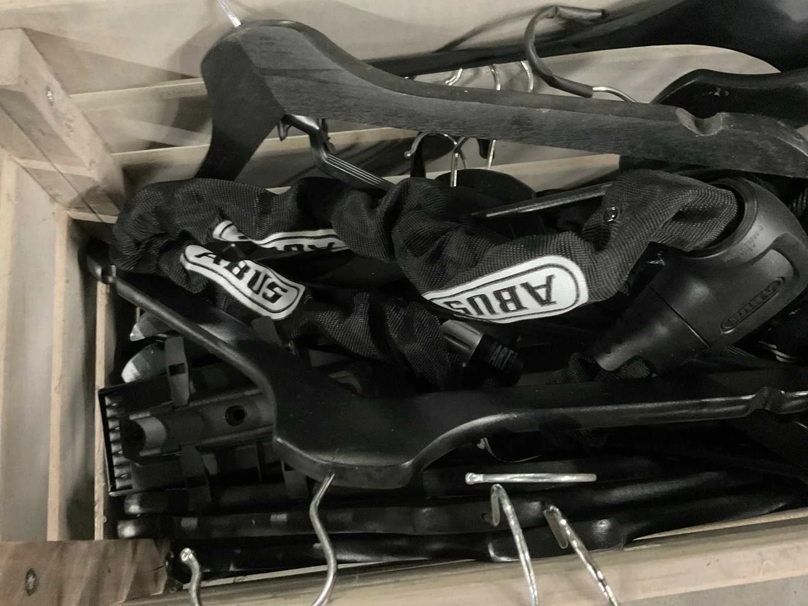 Inclusief monitor, rieten manden, bak met kleerhangers en fietsloten etc.