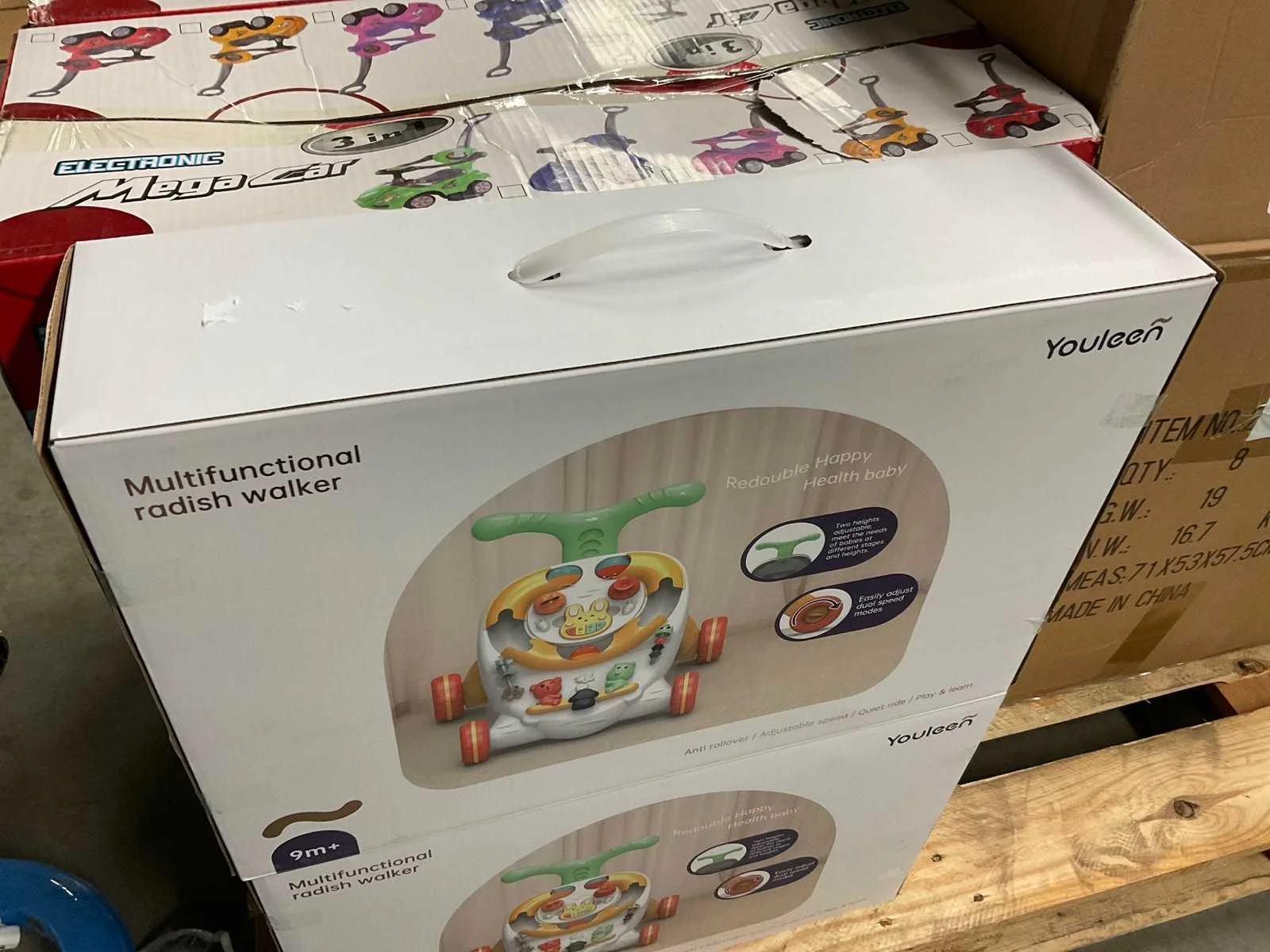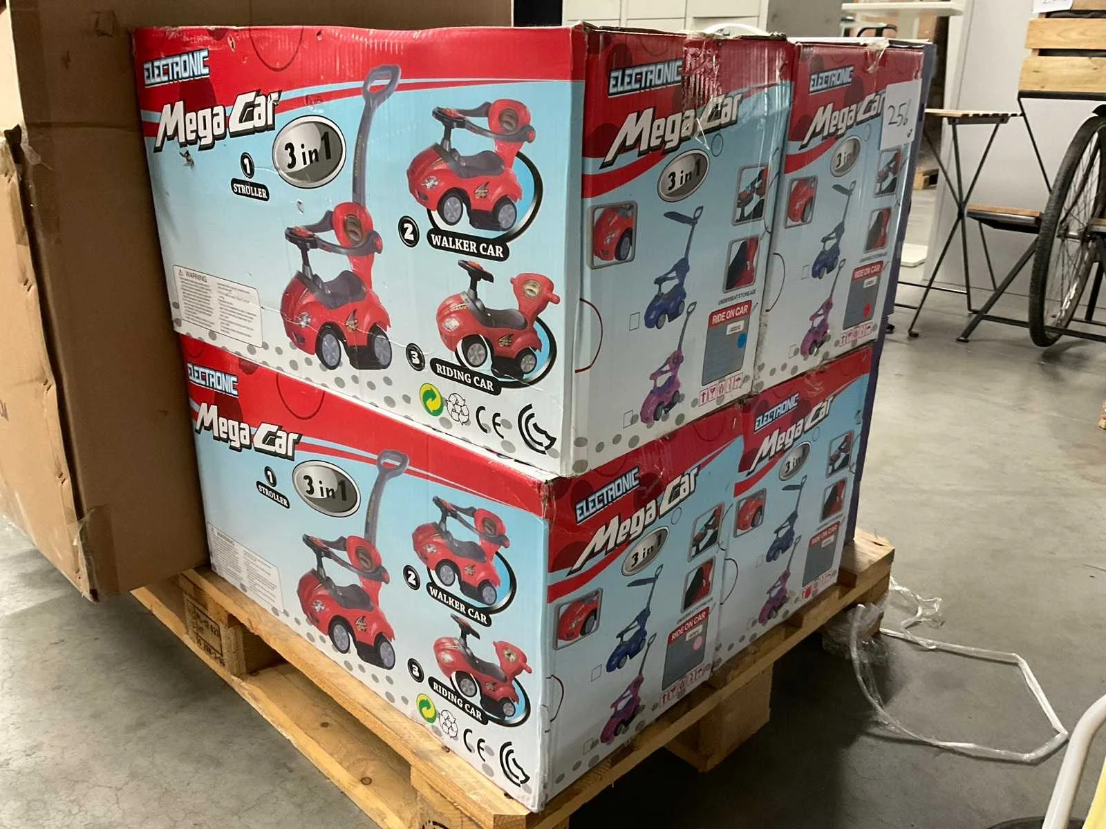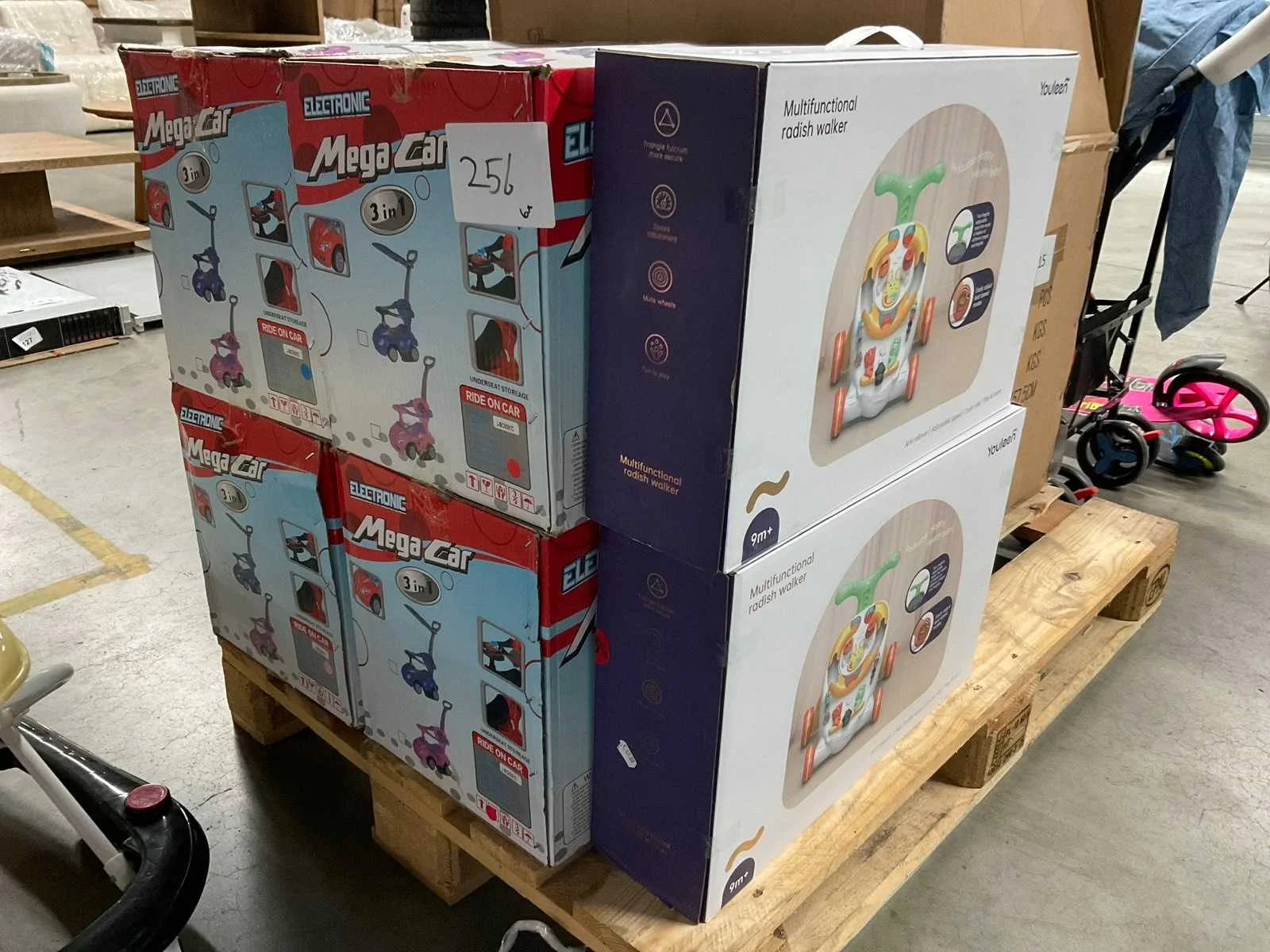 Bestaande uit: -4 multifunctionele kinderwagens van Electronic mega car. Te gebruiken als wandelwagen, loopauto of elektrisch rijdbaar. -2 multifunctionele kinderwagens van Youleen, voor baby’s ouder dan 9 maanden. pallet is niet inbegrepen