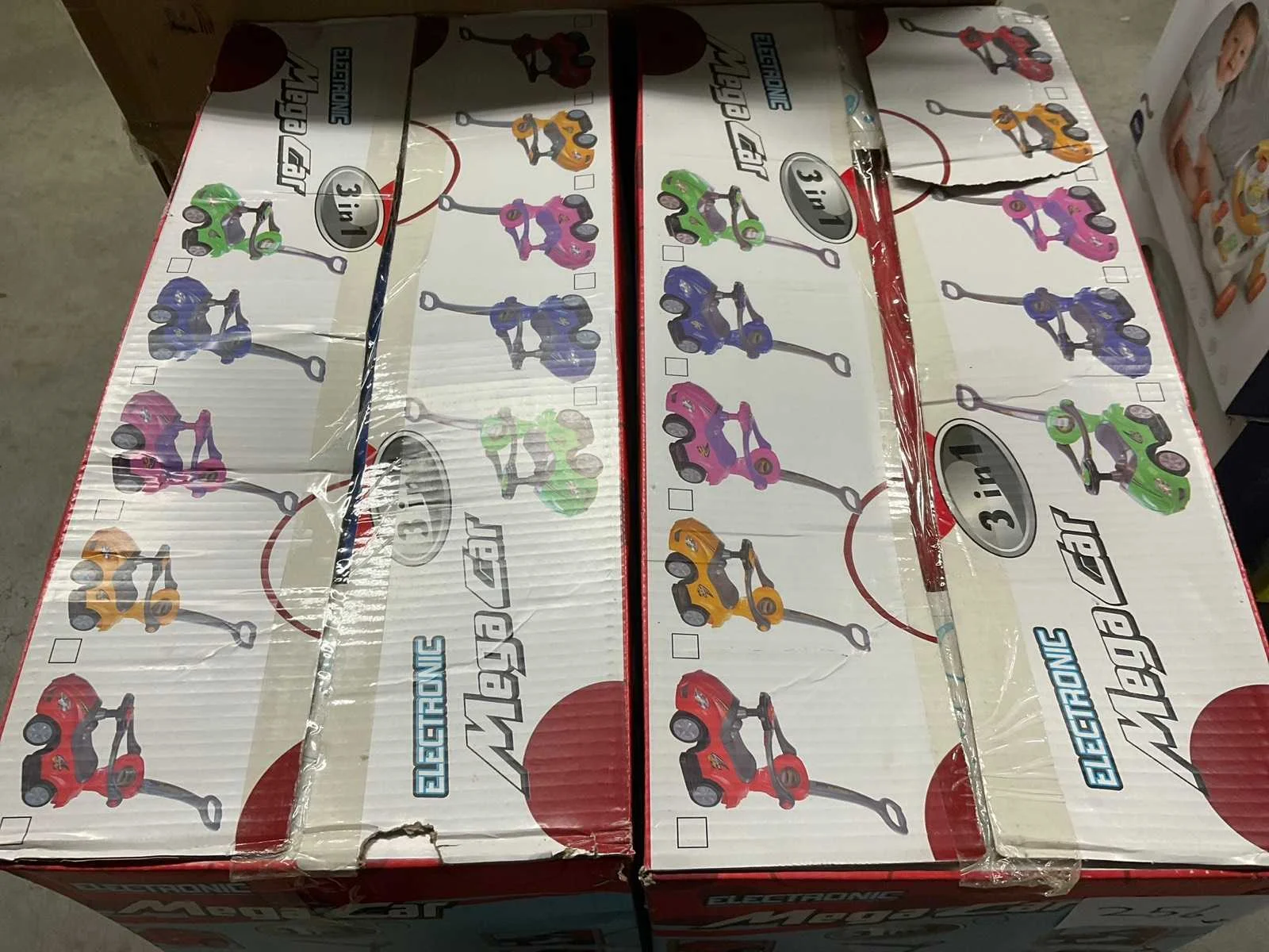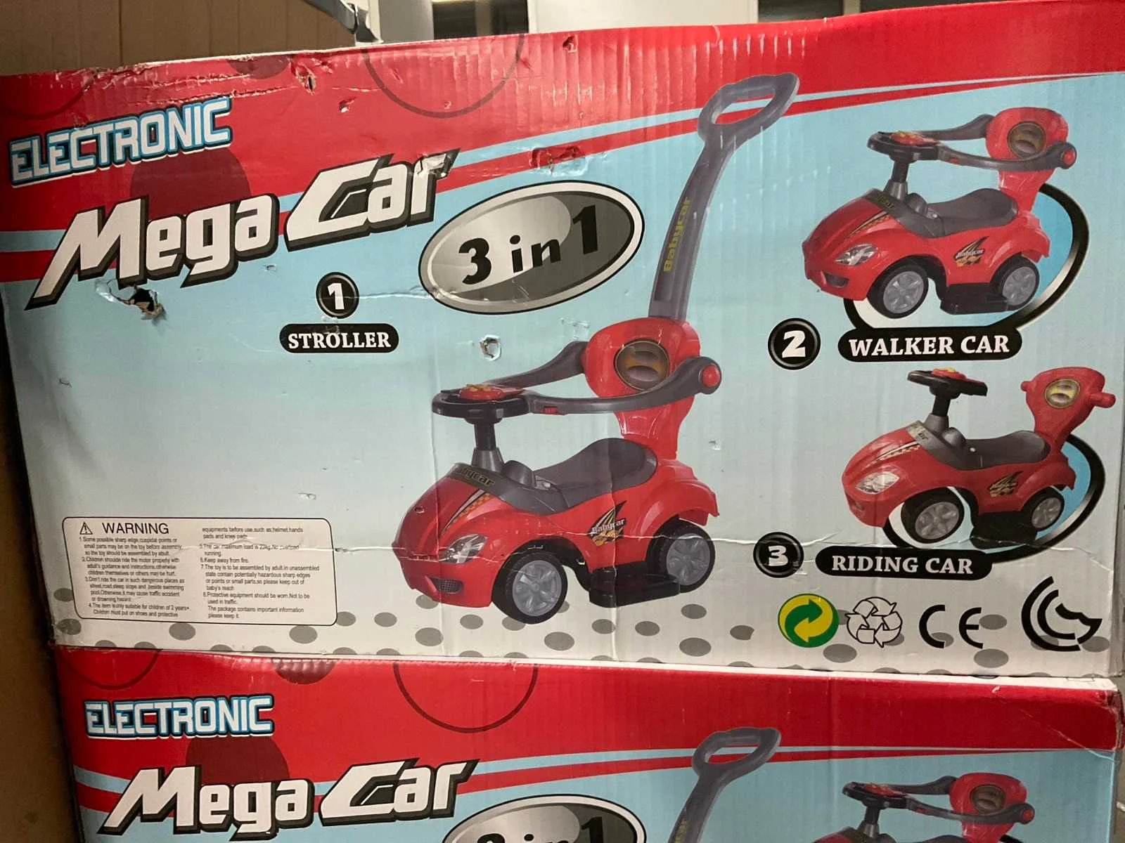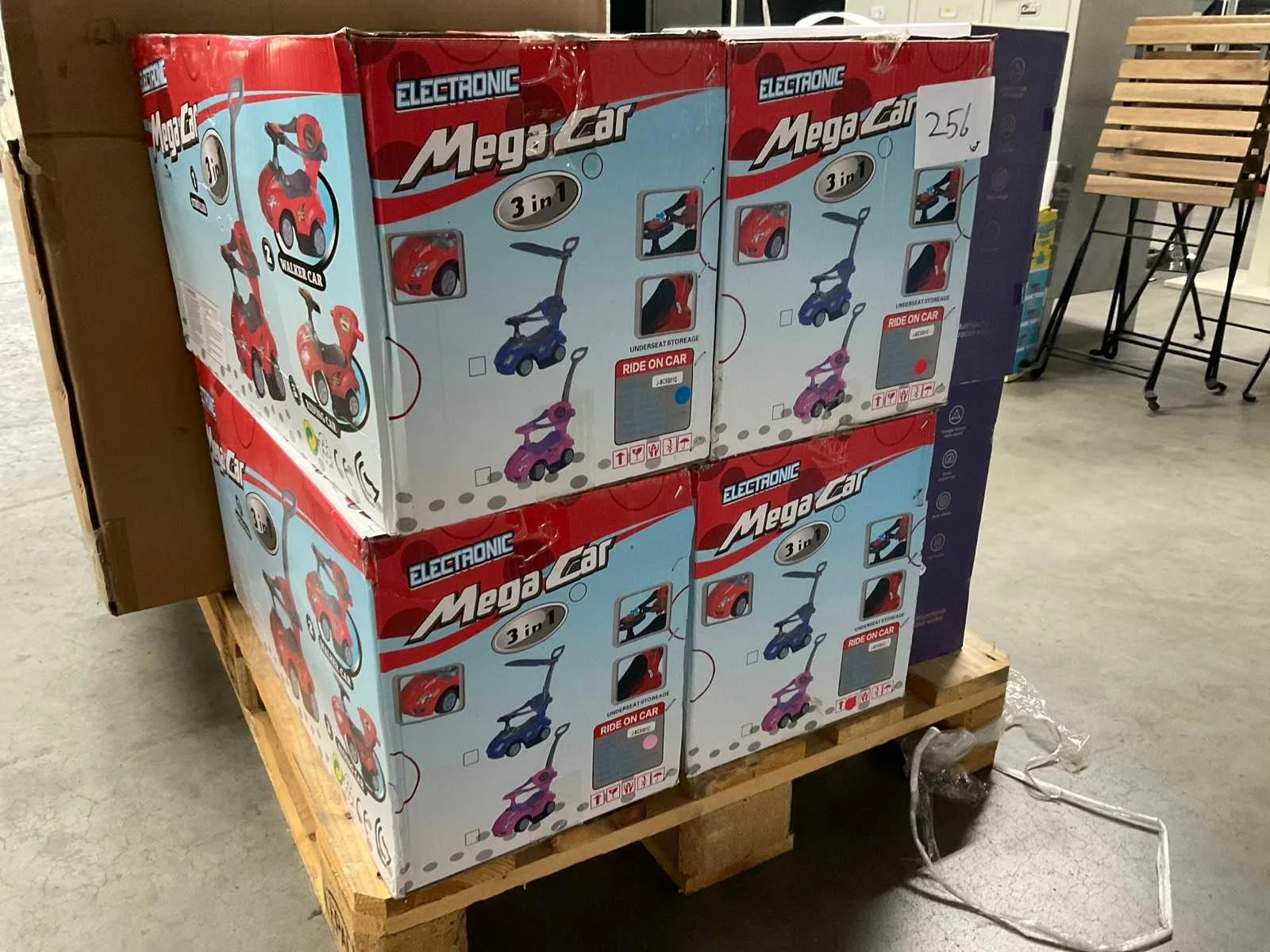 Bestaande uit: -4 multifunctionele kinderwagens van Electronic mega car. Te gebruiken als wandelwagen, loopauto of elektrisch rijdbaar. -2 multifunctionele kinderwagens van Youleen, voor baby’s ouder dan 9 maanden. pallet is niet inbegrepen