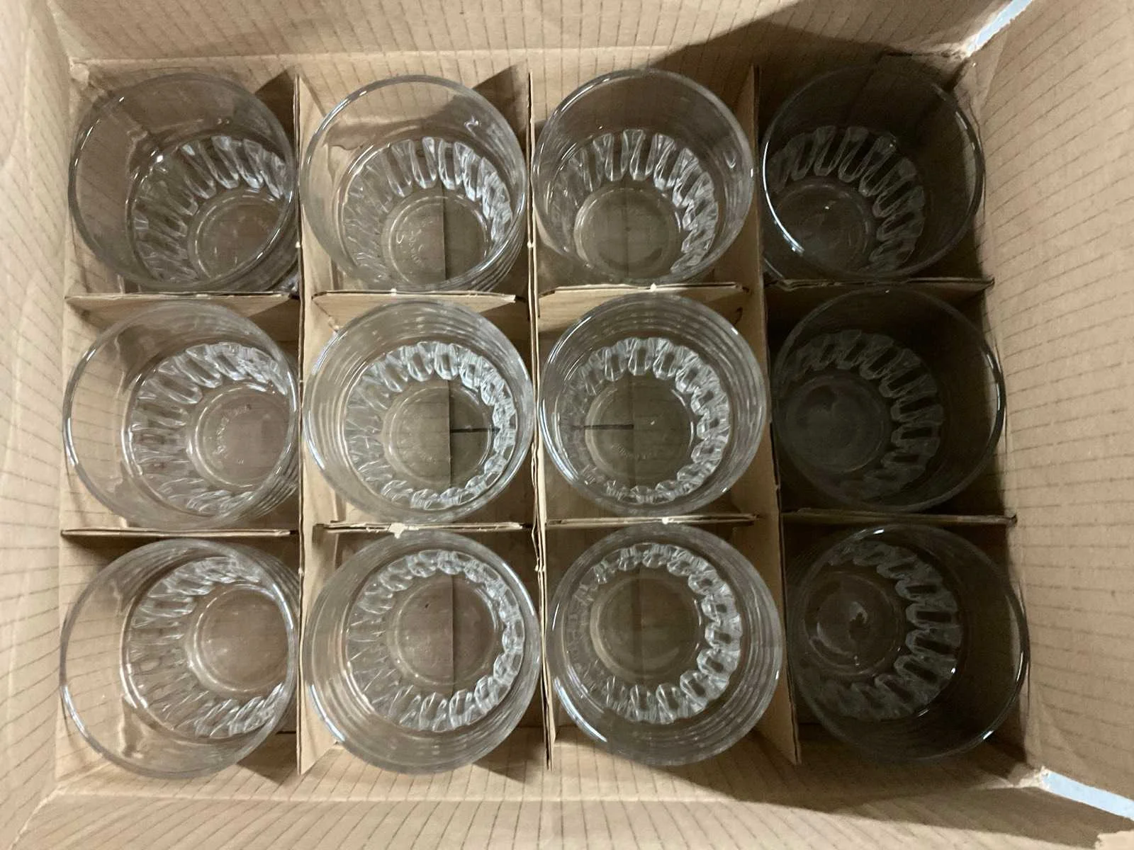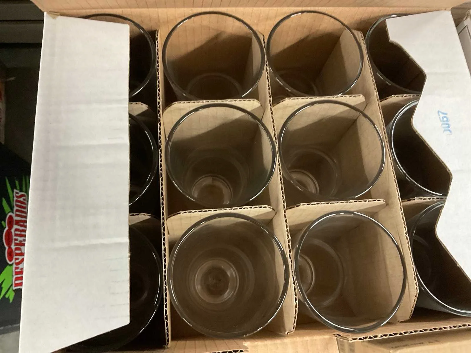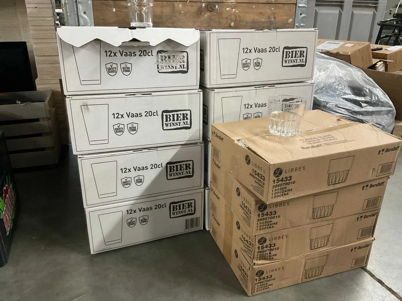Bestaande uit 8 dozen met elk 12 bierglazen van bierwinst.nl, en 4 dozen met elk 12 drankglazen van Libbey. Kleur: Transparant