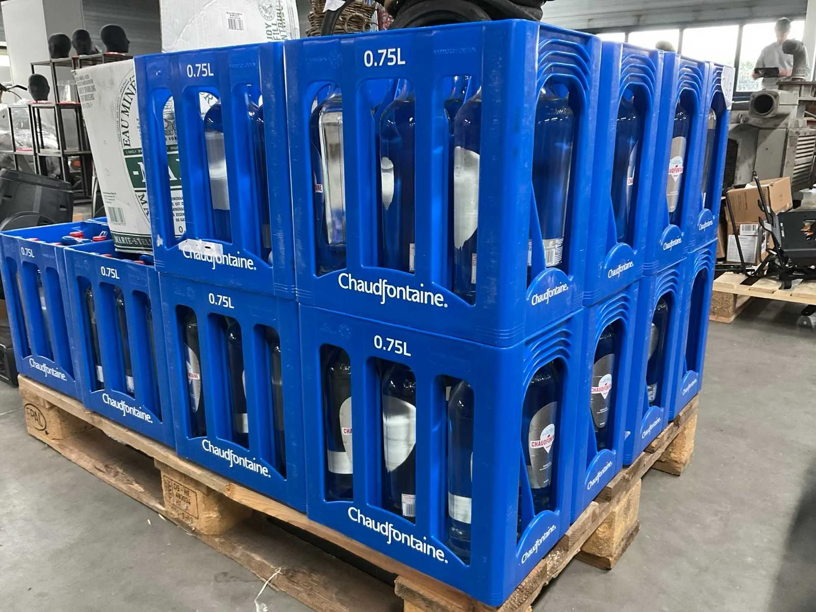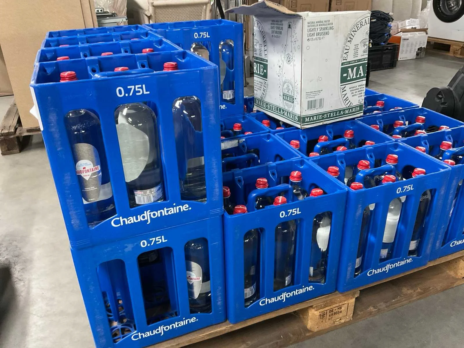 Bestaande uit flessen bruisend water in krat, en losse flessen lichtbruisend water in bijbehorende doos. Pallet niet inbegrepen. Merk: Chaudfontaine, Marie