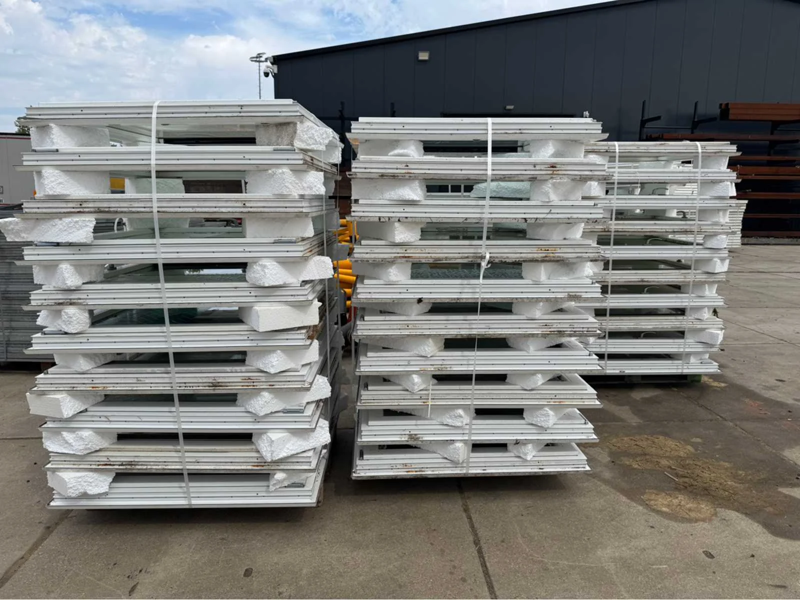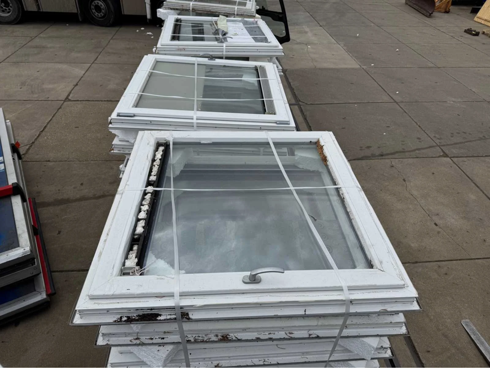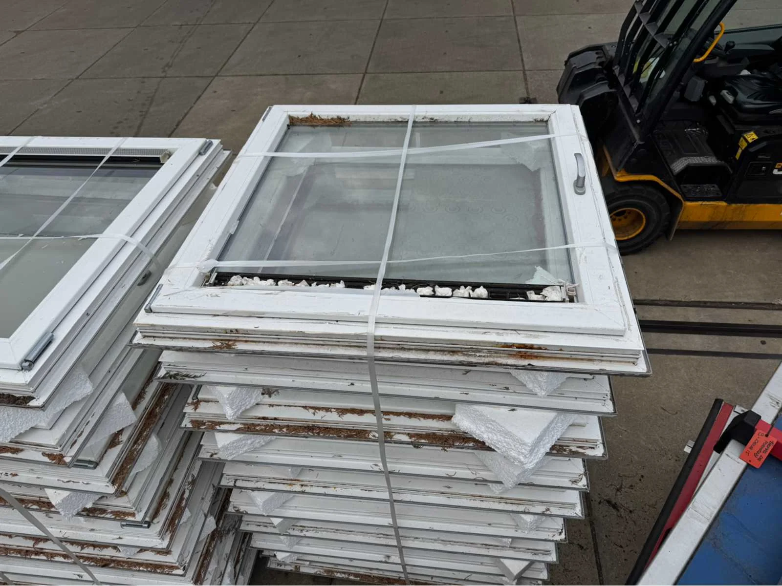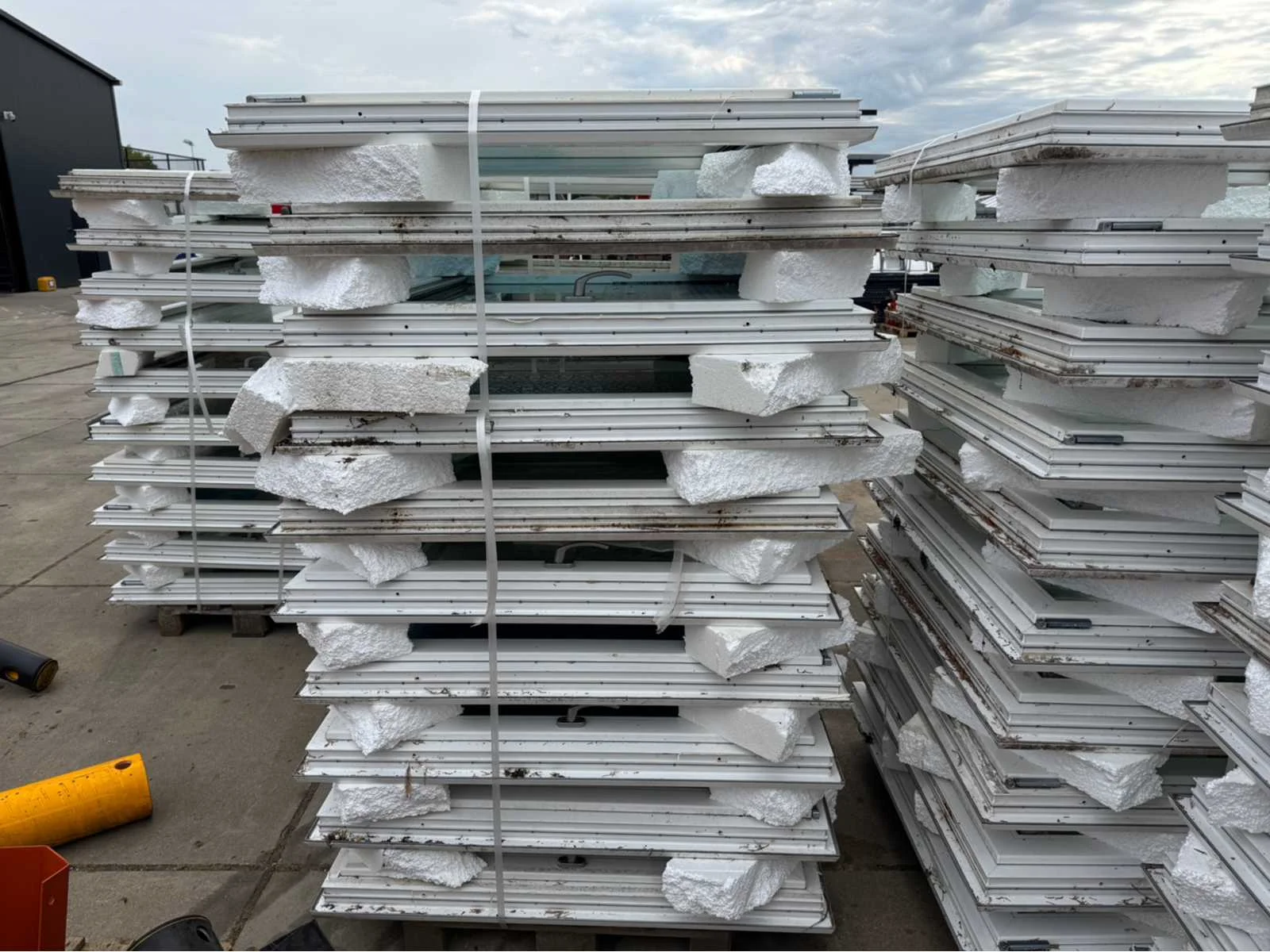 Kunststof kozijnen; kiep kantel; dubbel glas beglaasd; staan gestapeld met 10 stuks op een pallet; afmetingen van de kozijnen zijn ca 1900mm x 1900mm Beglaasd: true Afmeting h: 1900mm Afmeting b: 1900mm