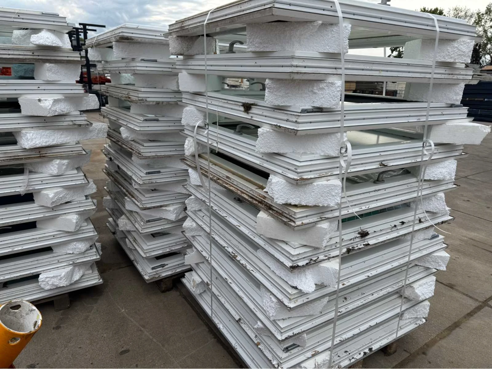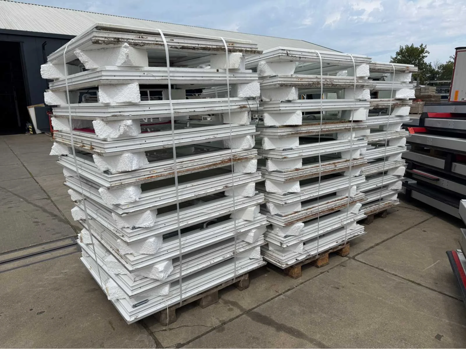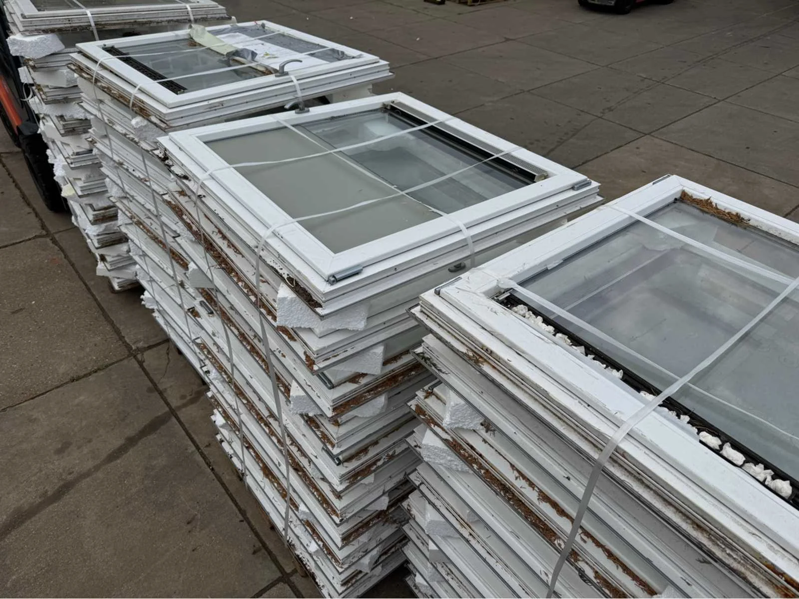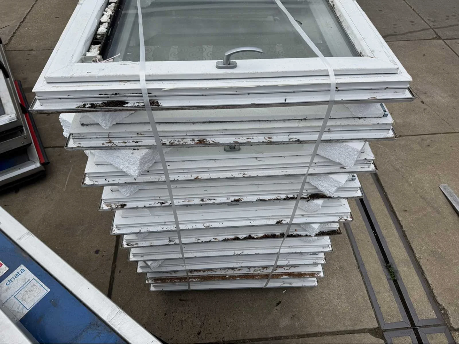 Kunststof kozijnen; kiep kantel; dubbel glas beglaasd; staan gestapeld met 10 stuks op een pallet; afmetingen van de kozijnen zijn ca 1900mm x 1900mm Beglaasd: true Afmeting h: 1900mm Afmeting b: 1900mm