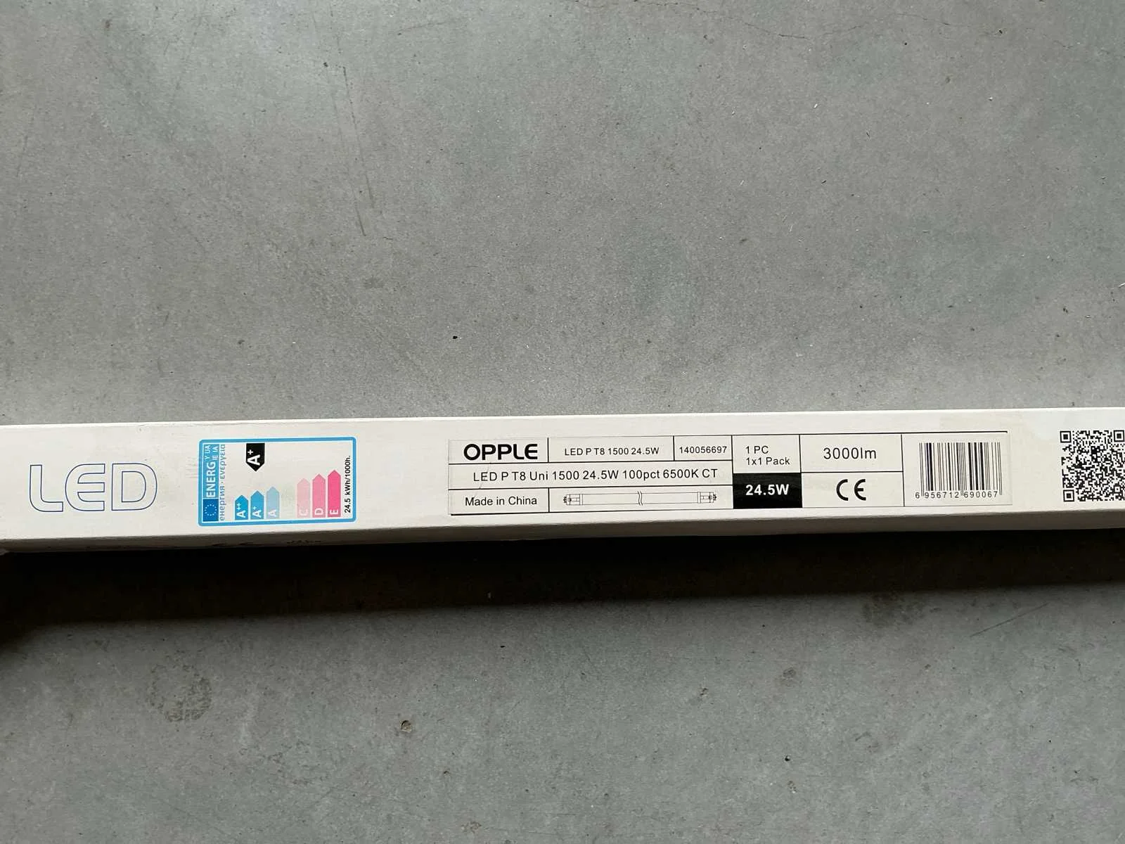 Ongebruikt in de verpakking; 140056695 Merk: Opple Model: P T8 UNI 1500 140056697 Kleurtemperatuur: 6500kK Wattage: 24.5W
