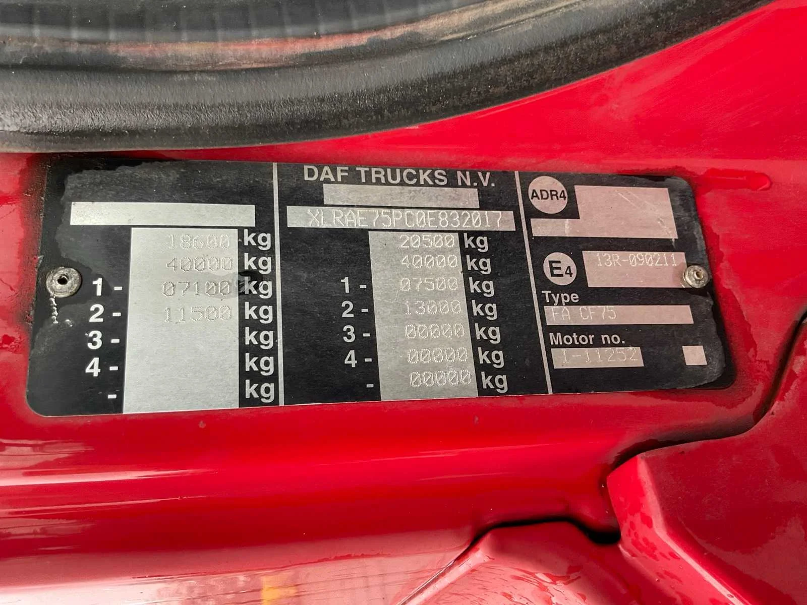 Met N.C.H. portaal container chassis Kenteken: BV-JL-88 Merk: DAF Type: 75.310 Bouwjaar: 2008 Chassisnummer VIN: XLRAE75PC0E832017 Cilinderinhoud: 9186cc Kilometerstand bij opname: 841161km APK vervaldatum: 2025-11-03 Datum eerste toelating: 2008-09-16 Datum eerste toelating (NL): 2008-09-16 Type transmissie: Automatisch Aantal assen: 2 Asconfiguratie: 4x2 Fuel Type: Diesel Laadvermogen: 8770kg Aantal sleutels: 1 Emissieklasse: 5 Startinformatie: Ja Nationaliteit documenten: Nederlandse Aantal zitplaatsen: 2 Zelf rijdend exporteren: Nee Automaat: true Diesel: true