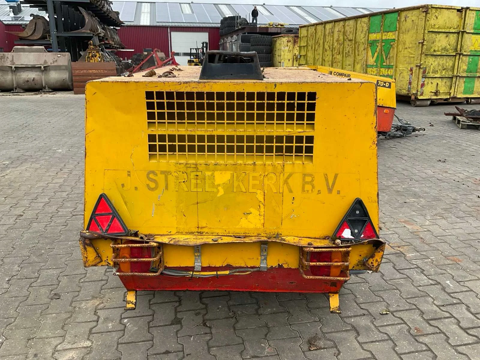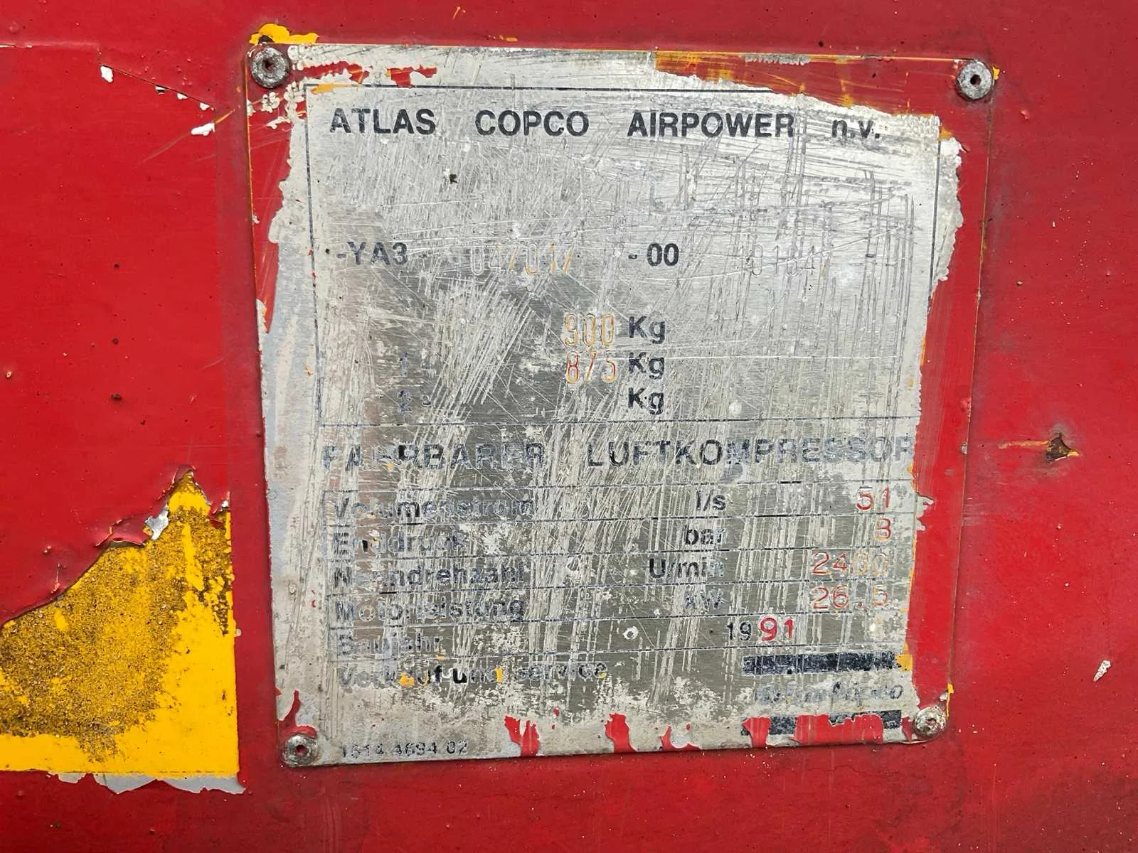 Deutz 3-cilinder dieselmotor Merk: Atlas Copco Type: XAS55 Bouwjaar: 1991 Serienummer: YA3-047017-00-0164 Capaciteit.: 8bar Luchtstroom: 3000l/min Vermogen: 26.5kW Afgelezen urenstand: 5868 Eigen gewicht: 900kg Totale afmeting L: 3500mm Totale afmeting Breedte: 1400mm Totale afmeting Hoogte: 1400mm