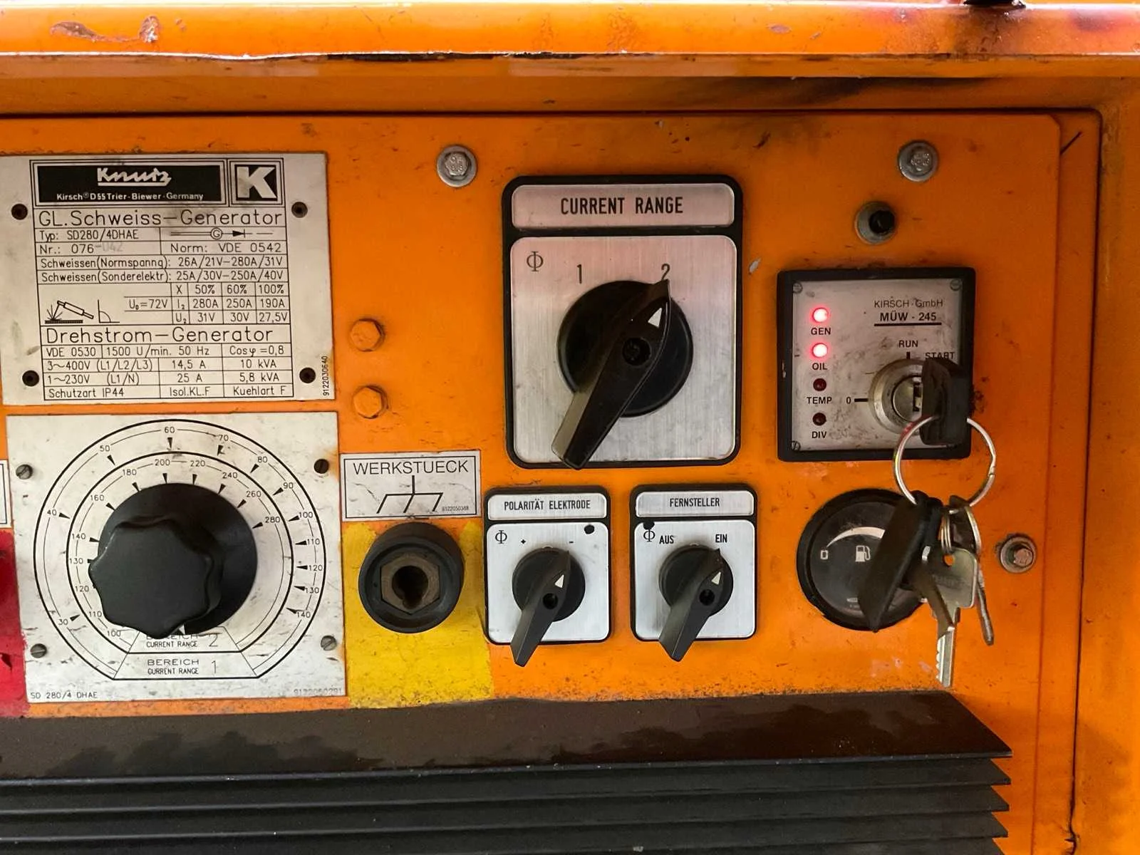 4253 draaiuren, Hatz 2L40C dieselmotor, Merk: Kirsch Type: SD280-4DHAE Bouwjaar: 1991 Serienummer: 18891019910361 Inschakelduur: 50% Max. lasvermogen: 280A Machinegewicht: 1300kg Afmeting l: 3400mm Afmeting b: 1350mm Afmeting h: 1450mm