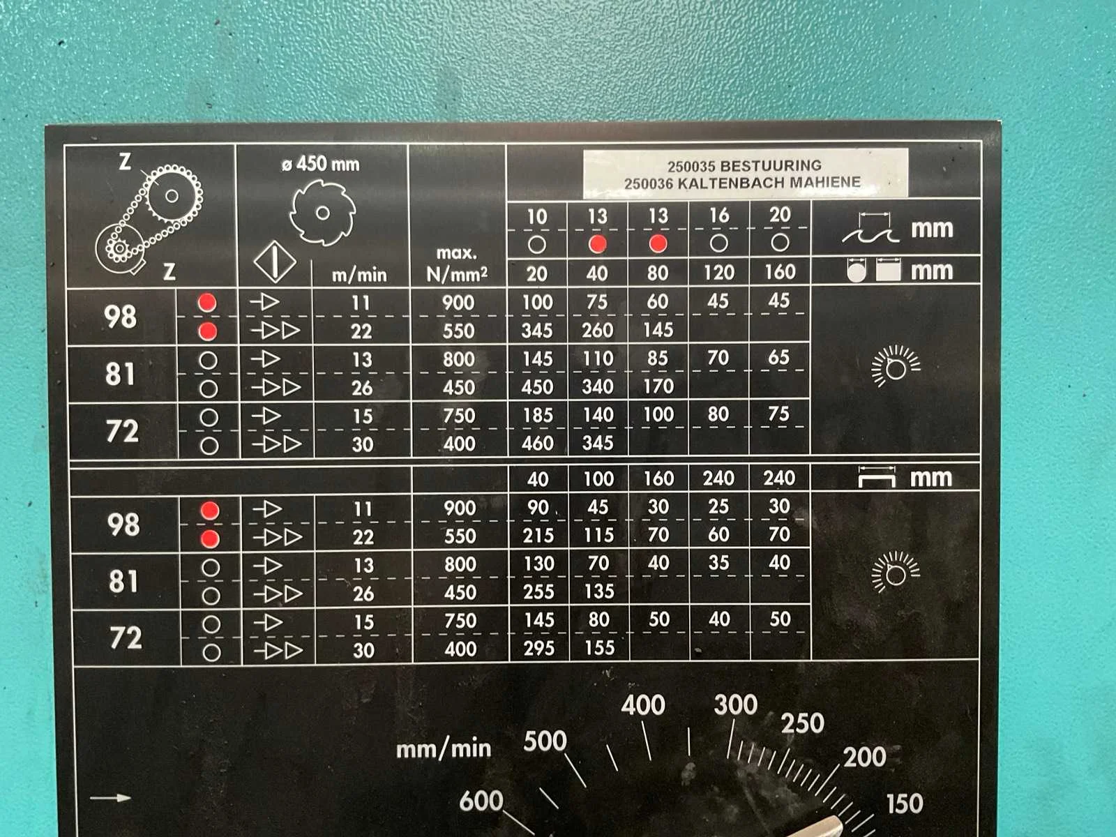 Rollenbaan van totaal 16 meter aan weerszijden is reeds gedemonteerd en ligt op een pallet, machine heeft een onbekend defect, voorzien van besturing en monitor, Merk: Kaltenbach Type: KKS 450 E Metaal Zaagblad Ø: 450mm Zaagbereik: 240mm Verstekhoek max.: 90° Tafel afmeting l: 350mm Tafel afmeting b: 900mm Koelmiddelpomp: true Digitale uitlezing: true Aansluiting: 400V Afmeting l: 1250mm Afmeting b: 1250mm Afmeting h: 2000mm