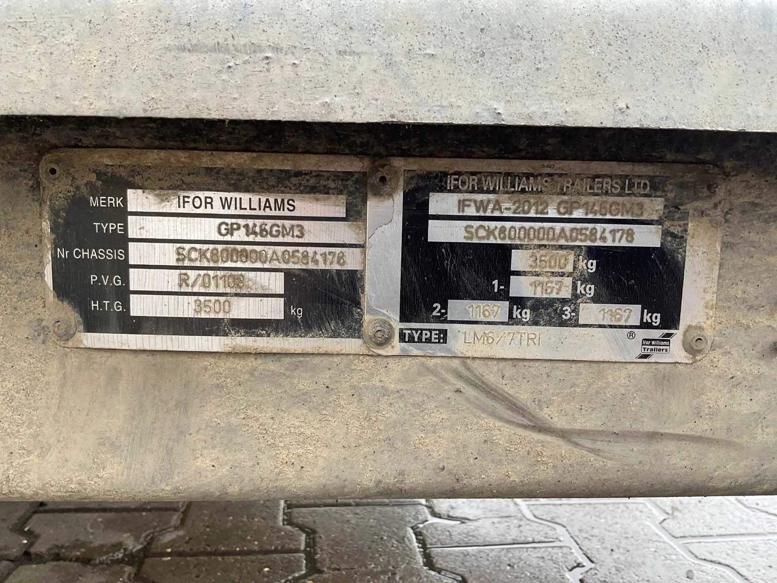 Aluminium traanplaat bodem, lier, 8x bevestiging in bak Merk: Ifor Williams Type: GP146GM3 Bouwjaar: 2010 Chassisnummer: SCK800000A0584178 Aantal assen: 3 Laadbak afmeting l: 430cm Laadbak afmeting b: 180cm Ledig gewicht: 1080kg Laadvermogen: 2420kg Datum eerste toelating: 2010-12-03 Datum eerste toelating (NL): 2010-12-03 Kenteken: 48-WG-NG Hoogte: 160cm Lengte: 630cm Breedte: 230cm Nationaliteit documenten: Nederland