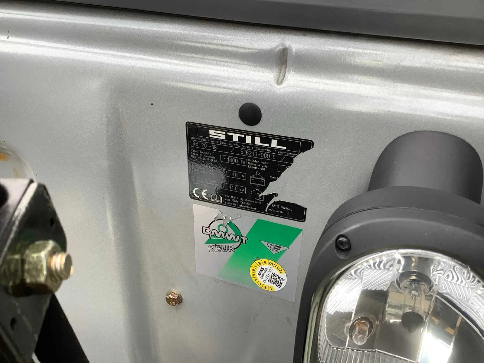 Op werking getest met freelift en oplader Merk: Still Type: rx20-18 Bouwjaar: 2017 Brandstof: Elektrisch Mast: Duplex Soort band: Volrubber banden Aantal wielen: 4 Afgelezen urenstand: 13733 Accu lader: true Free-lift: true Duplex mast: true Hefvermogen: 1800kg Lepellengte: 1400mm Hefhoogte: 6400mm Vol rubber banden: true Minimale doorrijhoogte: 2300mm