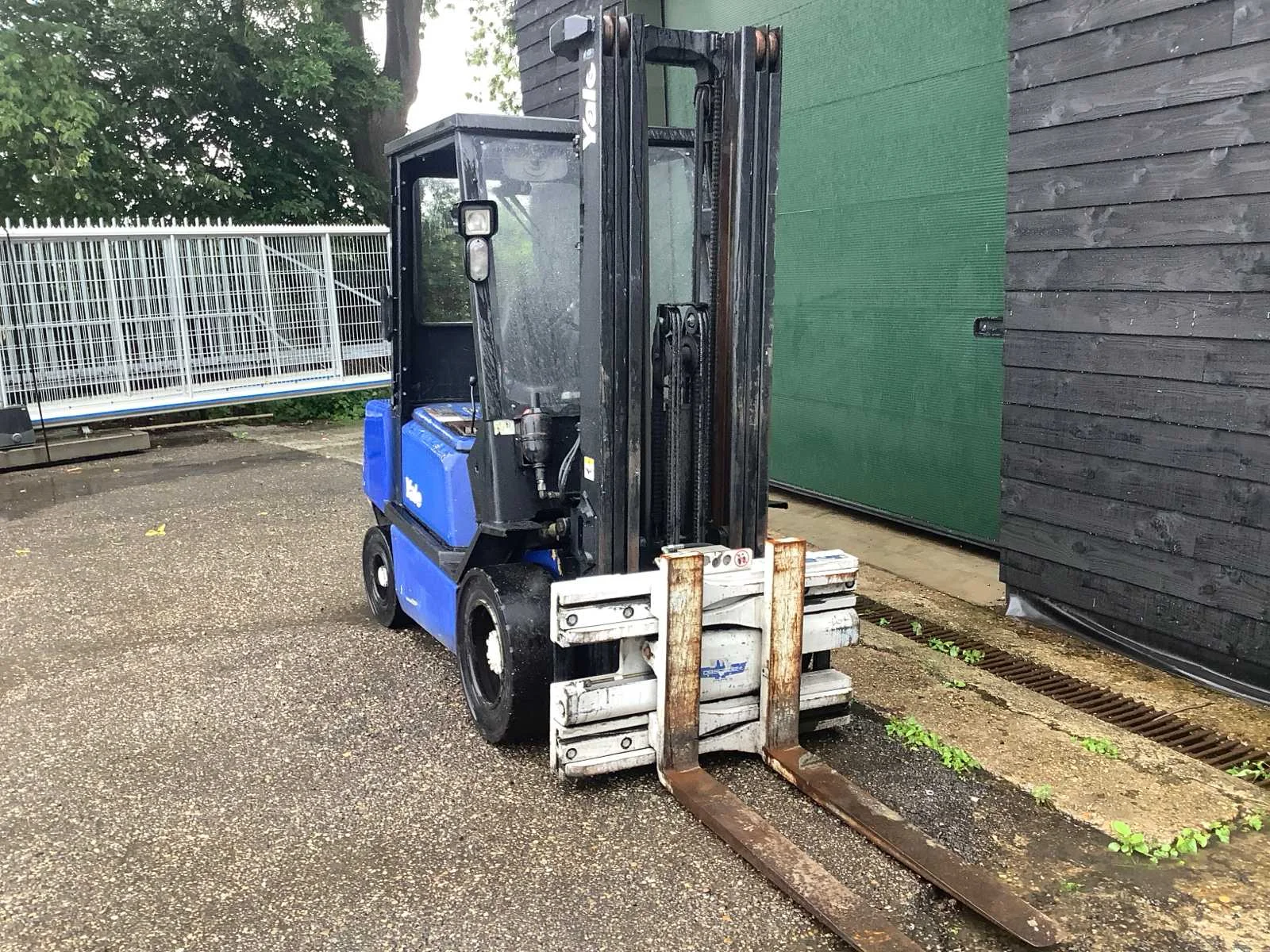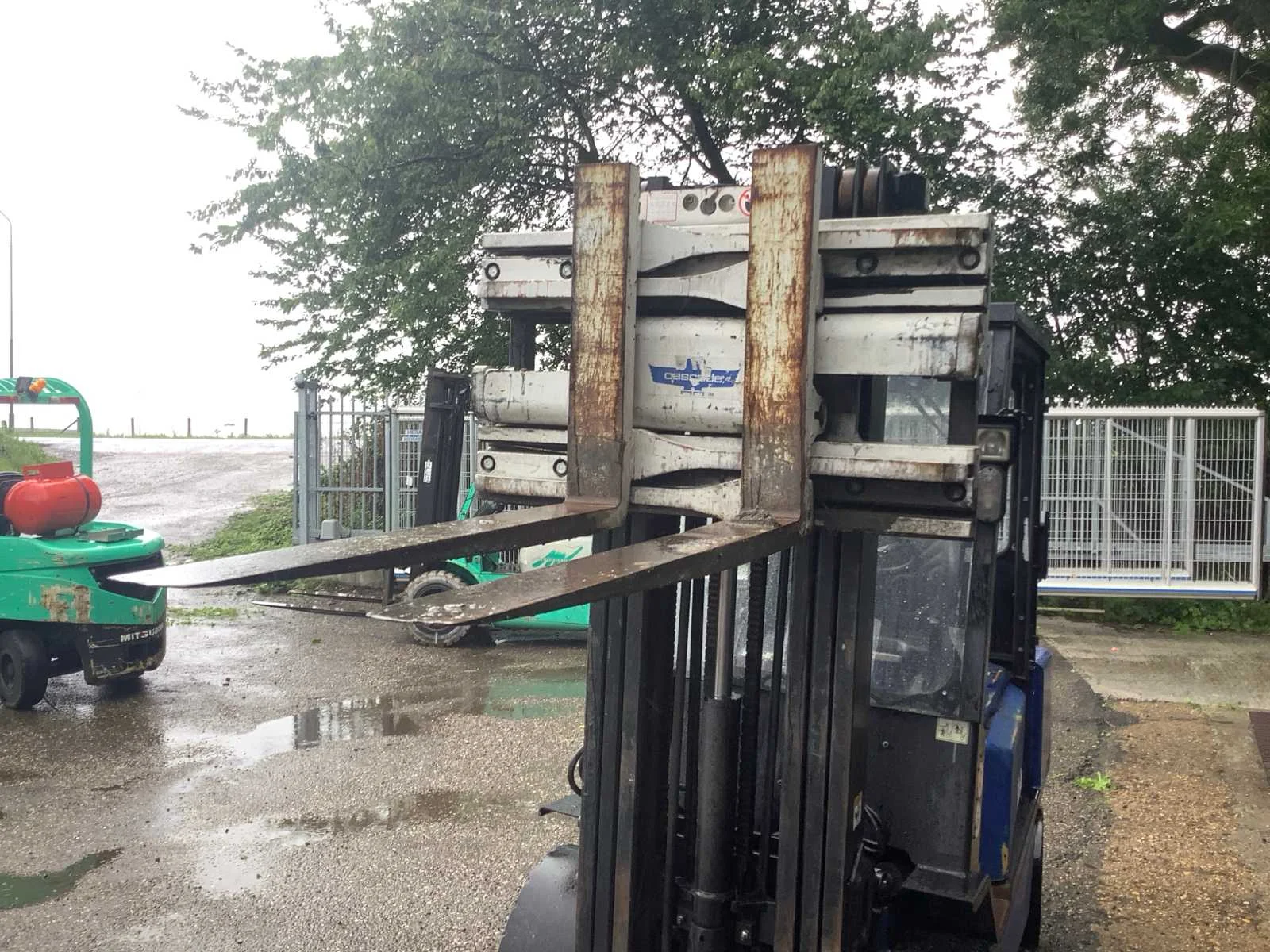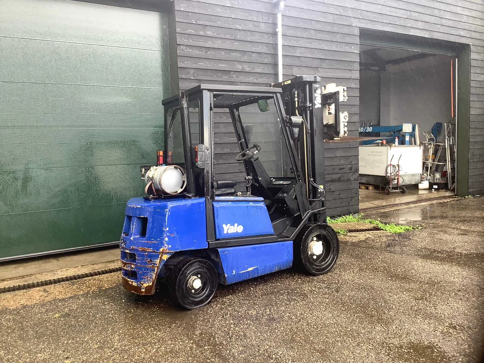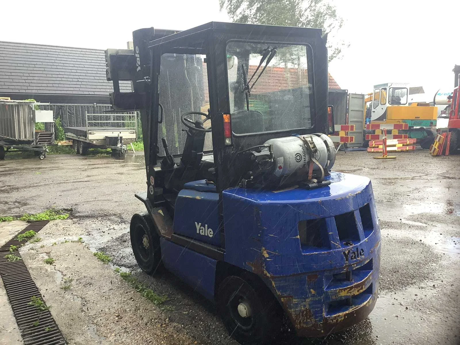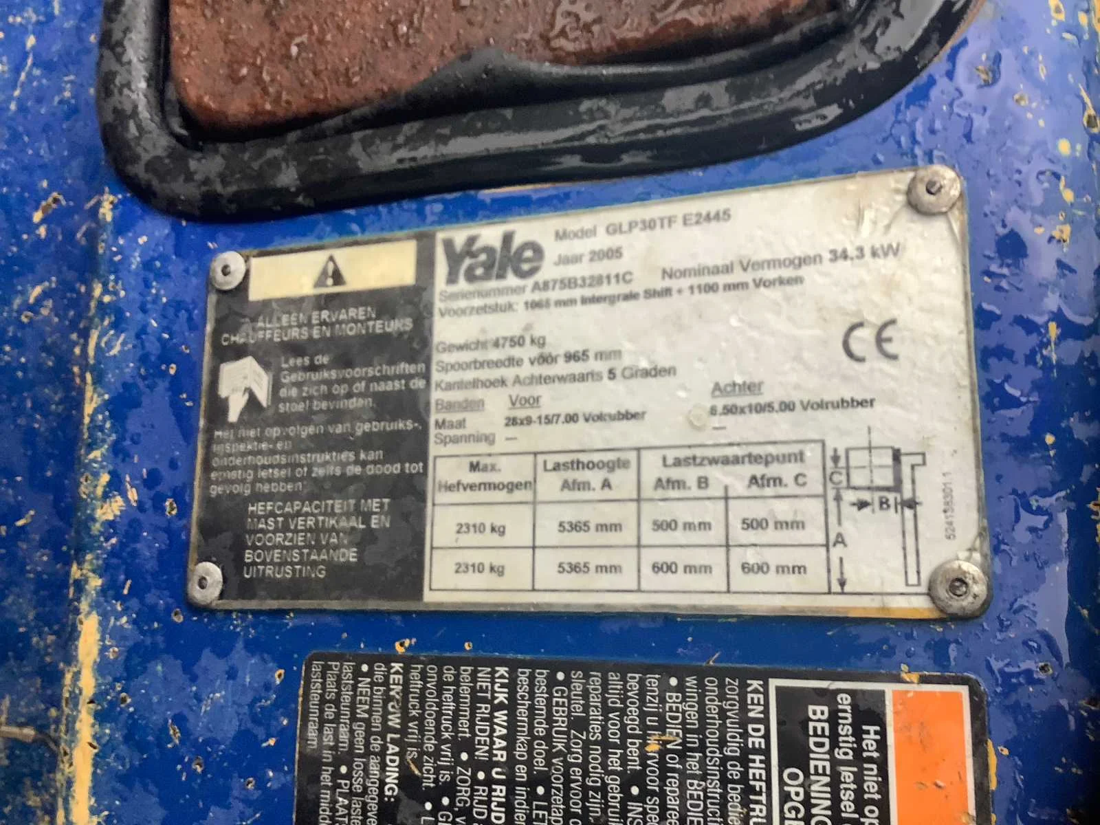 Op werking getest start rijd voor en achteruit en heft incl gasfles Merk: Yale Type: glp30tf Bouwjaar: 2005 Mast: Triple Soort band: Volrubber banden Aantal wielen: 4 Afgelezen urenstand: 6850 Free-lift: true Side-shift: true Triple mast: true Eigen gewicht: 4750kg Hefvermogen: 2500kg Lepellengte: 1000mm Max. hefhoogte: 5200mm Vol rubber banden: true Minimale doorrijhoogte: 2500mm Totale afmeting L: 4000mm Totale afmeting Hoogte: 2mm LPG: true