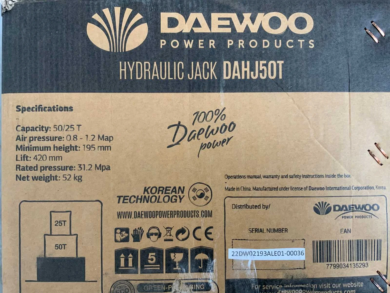 Max hoogte 420mm; min hoogte 195mm; 5635 Merk: Daewoo Type: 50T. DAHJ Bouwjaar: 2023 Capaciteit.: 50.00t Eigen gewicht: 52kg