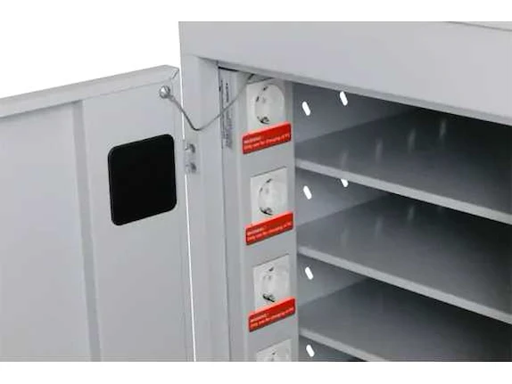 Opberg/oplaadstation voor tablets en laptops, Voorzien van zwenkwielen, 230v aansluiting, 10 vakken, betreft een ongebruikt product Merk: Povag Lengte: 53cm Breedte: 54cm Hoogte: 124cm