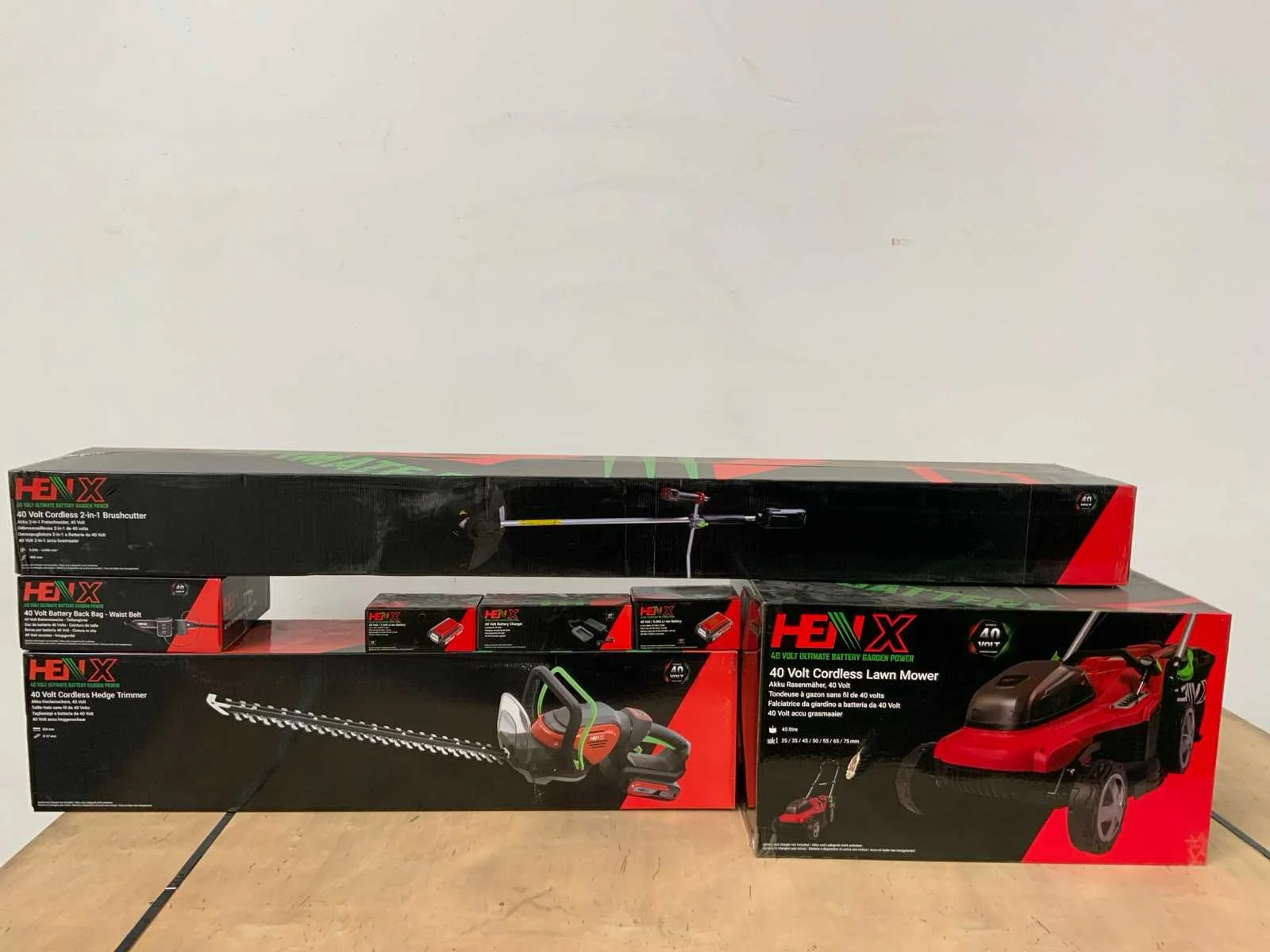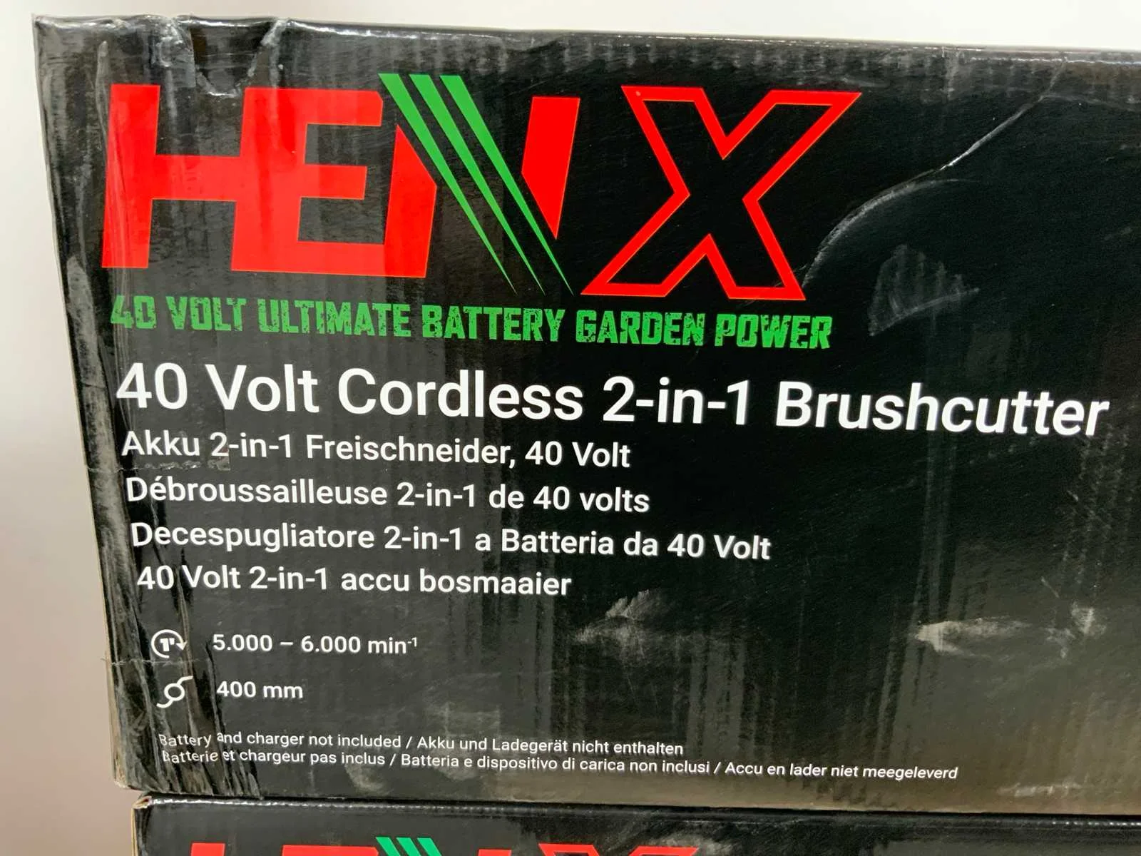 2 accu’s; 2.5AH & 5.0AH; 1x grasmaaier; 1x heggenschaar; 1x 2in1 bruschcutter; 40V batterij waist belt; Merk: Henx