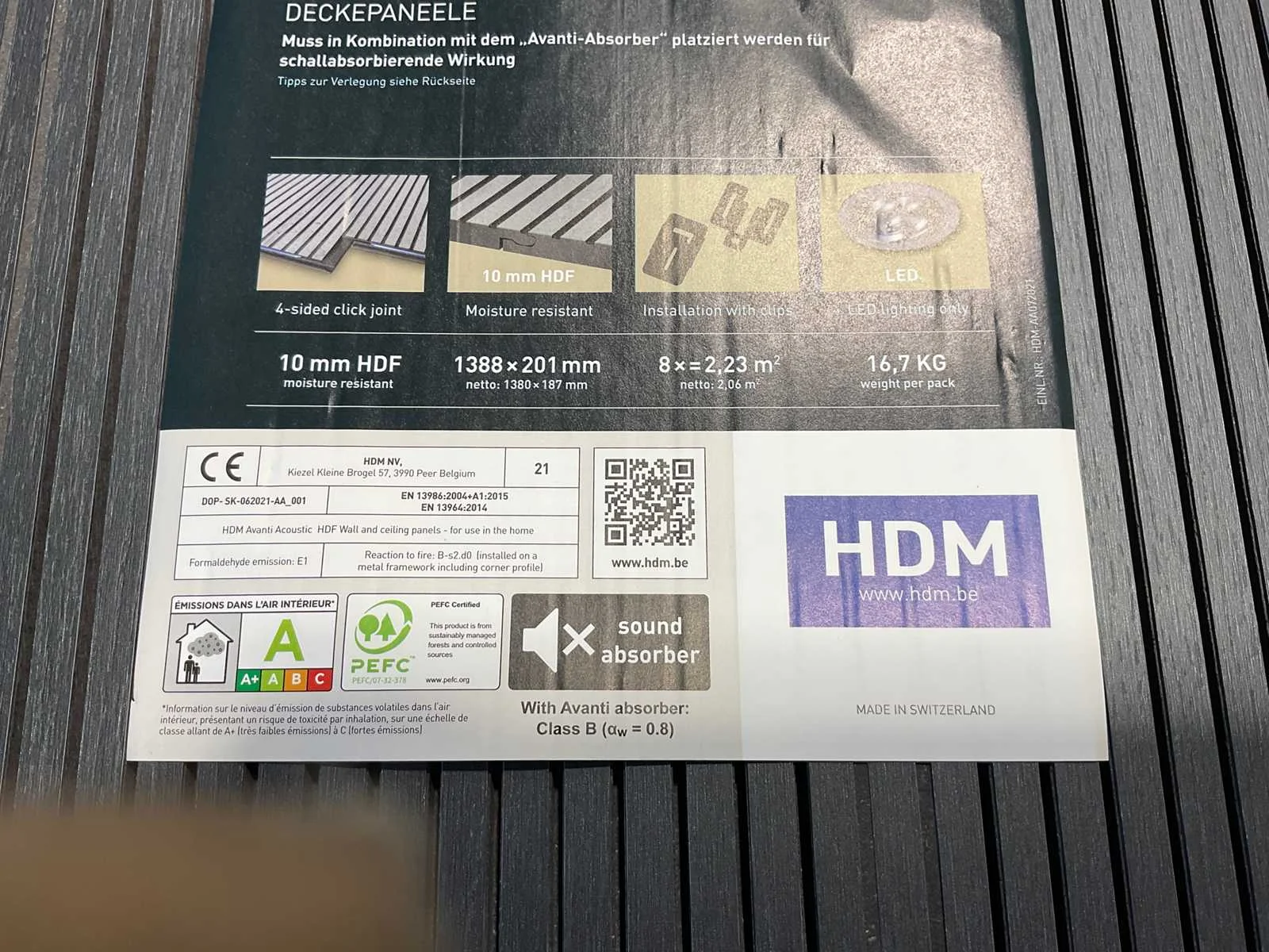 De Avanti Acoustic panelen combineren een modern lattenwand design met functionele geluidsdemping en zijn daarmee de ideale keuze voor zowel wanden als plafonds. Gemaakt van 10 mm vochtwerend HDF met een hoogwaardig melamine oppervlak, bieden ze een duurzame en stijlvolle afwerking. De panelen hebben een formaat van 138,8 x 20,1 cm en worden geleverd in pakken van 8 stuks (2,23 m²) met een gewicht van 16,7 kg per pak. Dankzij de klikverbinding aan vier zijden zijn de panelen snel, strak en naadloos te monteren met clips, wat zorgt voor een professionele uitstraling met minimale inspanning. Merk: HDM Model: Avanti Product type: Wandpaneel Kleur: Inox Black Gewicht: 16.7kg Lengte: 138.8cm Breedte: 20.1cm Hoogte: 1cm Materiaal: HDF