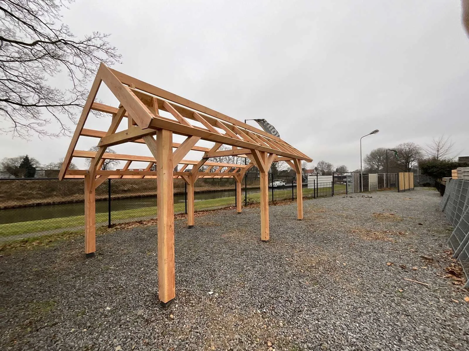 Constructie zonder dakbeschot Palen 150x150mm Douglas fijnbezaagd (6st.) Ligger voorzijde 150x150mm ligger achterzijde 120x120mm Spant 50x150mm Schoren 120x120mm 50x150mm dakbalken 50x150mm boeideel 20x200mm 20x100mm Dakmaat 5600x3600mm Buitenzijde palen 5000x3000mm Afmeting Pakket: 350x125x140cm, 1000kg Geleverd in een bouwpakket Alle onderdelen op maat gezaagd Geleverd met handleiding en bevestigingsmateriaal Geleverd zonder grondpoeren Houtsoort: Douglas Bevestigingsmateriaal: true Constructieplan: true Eigen gewicht: 1000 Totale afmeting L: 5600 Totale afmeting Breedte: 3600 Totale afmeting Hoogte: 3250 Verpakt per: 1 pakket Verpakking afm. l: 3500mm Verpakking afm. w: 1250mm Verpakking afm. h: 1400mm