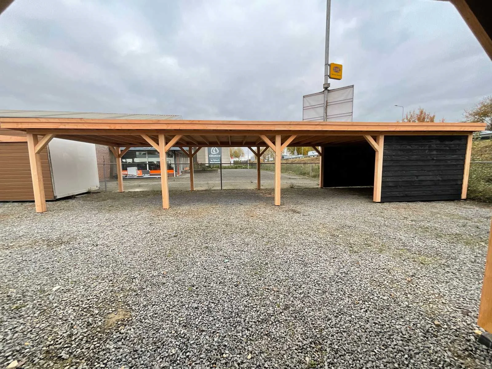 Specificaties Buitenverblijf: Palen: 150x150 mm Liggers: 120x120 mm Dakbalken: 50x150 mm Dakplanken: 18 mm dik Wanden: Zweeds rabat, zwart geïmpregneerd, bevestigd op vuren regelwerk (45x60 mm). De rabatdelen moeten bij montage nog op maat worden gezaagd. Het buitenverblijf wordt geleverd als bouwpakket, op maat gezaagd, inclusief bevestigingsmateriaal en een handleiding. Afmeting: 1800x500 cm (buitenmaat dakrand) Berging: Drie zijden dicht, totale afmeting 300x400 cm Aantal palen: 14 stuks Dakbedekking en paalhouders: Niet inbegrepen Hoogte: Doorloophoogte: 225 cm Totale hoogte: 257 cm Breedte en diepte: De opgegeven maat betreft de dakmaat. Dakoversteek: Links, rechts en voorzijde: 30 cm Achterzijde: Geen oversteek Afmetingen pakket: 125x500x140 cm (BxLxH) Gewicht: 2500 kg Model: Vrijstaand Gewicht: 2500kg Lengte: 1800cm Breedte: 500cm Hoogte: 257cm Materiaal: Douglas