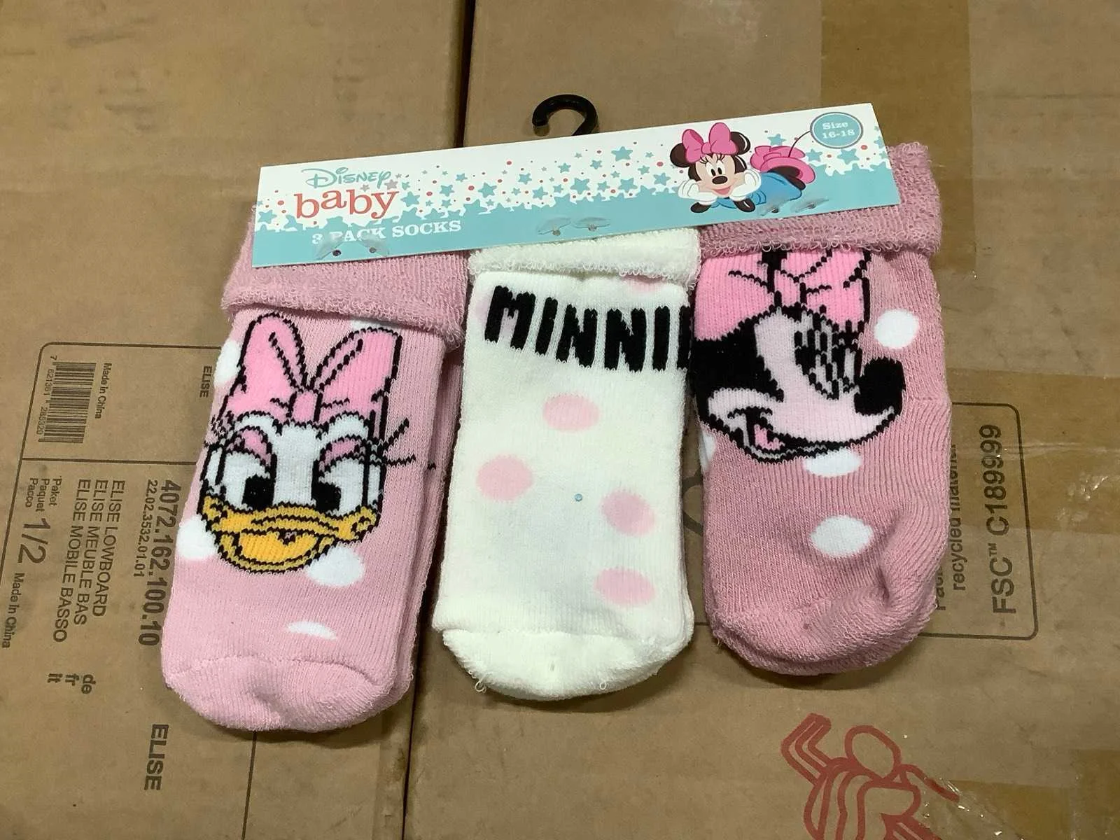 Partij van 100 stuks originele Disney baby- en kinderkleding (officieel trademark). De mix bevat sokken (maat 16/18 & 19/22), pyjama’s, rompers, schortjes en joggingpakken in kledingmaten 62/68, 74/80 en 86/92. Telling per kledingstuk: Een 3-pack telt als 3 stuks, een 2-pack als 2 stuks. Bij setjes (zoals pyjama’s) worden broek en shirt apart geteld. Ideaal voor wederverkoop, outlet of marktkraam. Bestaande uit: Baby- Kinderkleindg 1e: Pyjama 2e: Sokken 3e: Jogginspak 4e: Schort 5e: Rompers