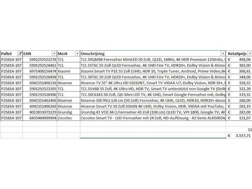 Dit betreft een partij televisies retourgoederen van een grote online retailer. De partij bestaat uit diverse diverse maten televisies. Aantal stuks: 11. Retailwaarde: €3.537,- De televisies zijn niet werkend en zijn te gebruiken voor onderdelen. Kom op de kijkdag om te om zo een goed beeld te krijgen van de reden van retour. Zie foto's voor lijst met inhoud. Merk: Pallet