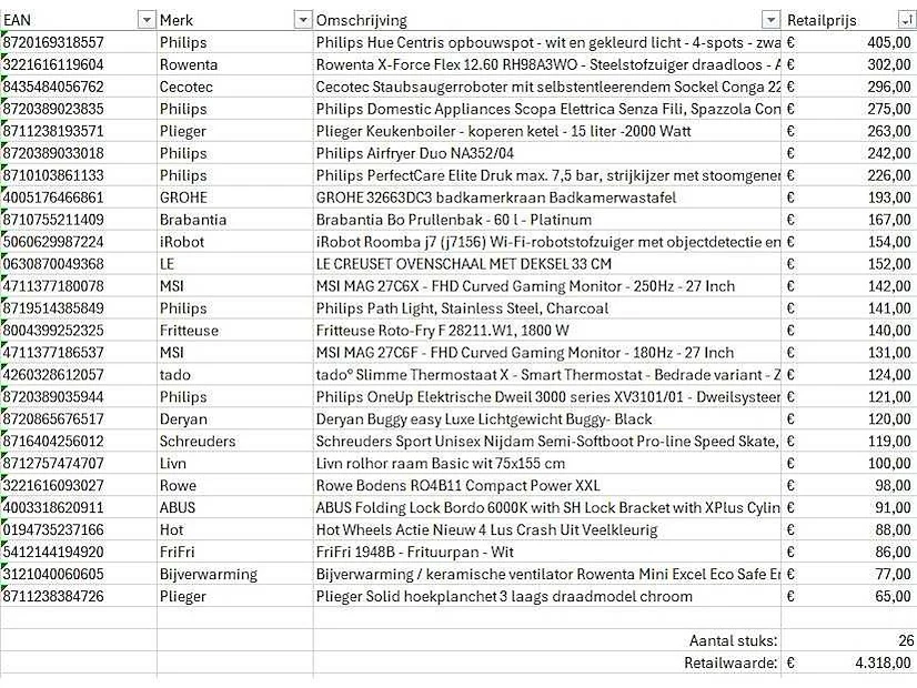 Dit betreft een partij A-merk retourgoederen van een grote online retailer. De partij bestaat uit diverse productcategorieën. Aantal stuks: 26. Retailwaarde: €4318,- Ongecontroleerd: werking onbekend (mix van werkend, incompleet, beschadigd, te gebruiken voor onderdelen). Kom op de kijkdag om te om zo een goed beeld te krijgen van de reden van retour. Zie foto's voor lijst met inhoud. Bezorgtermijn 14 dagen Merk: Pallet Retourgoederen