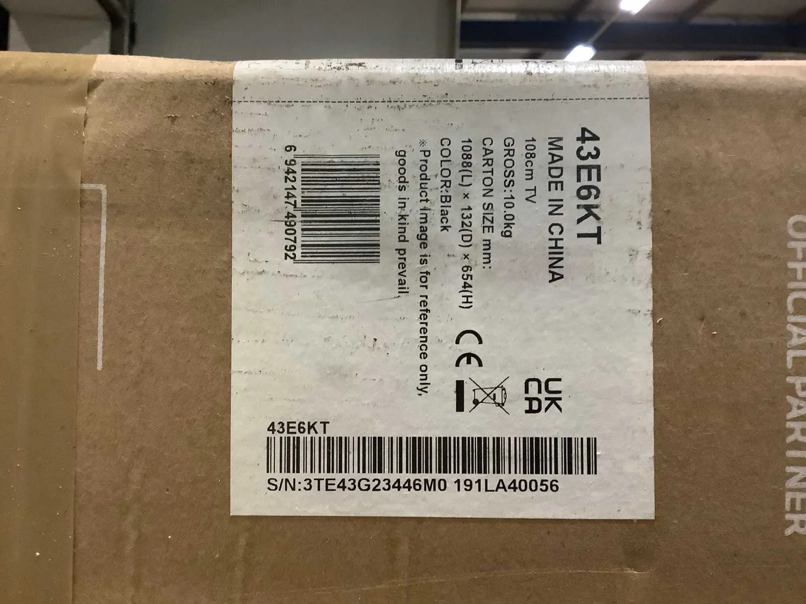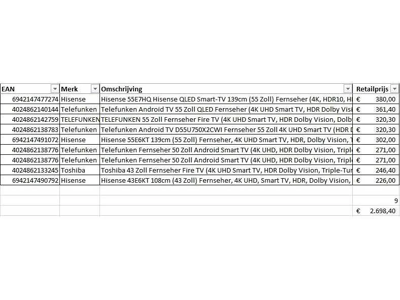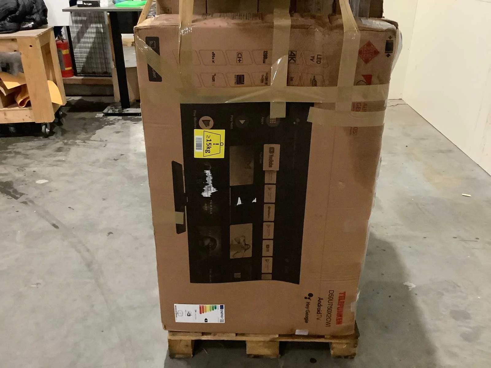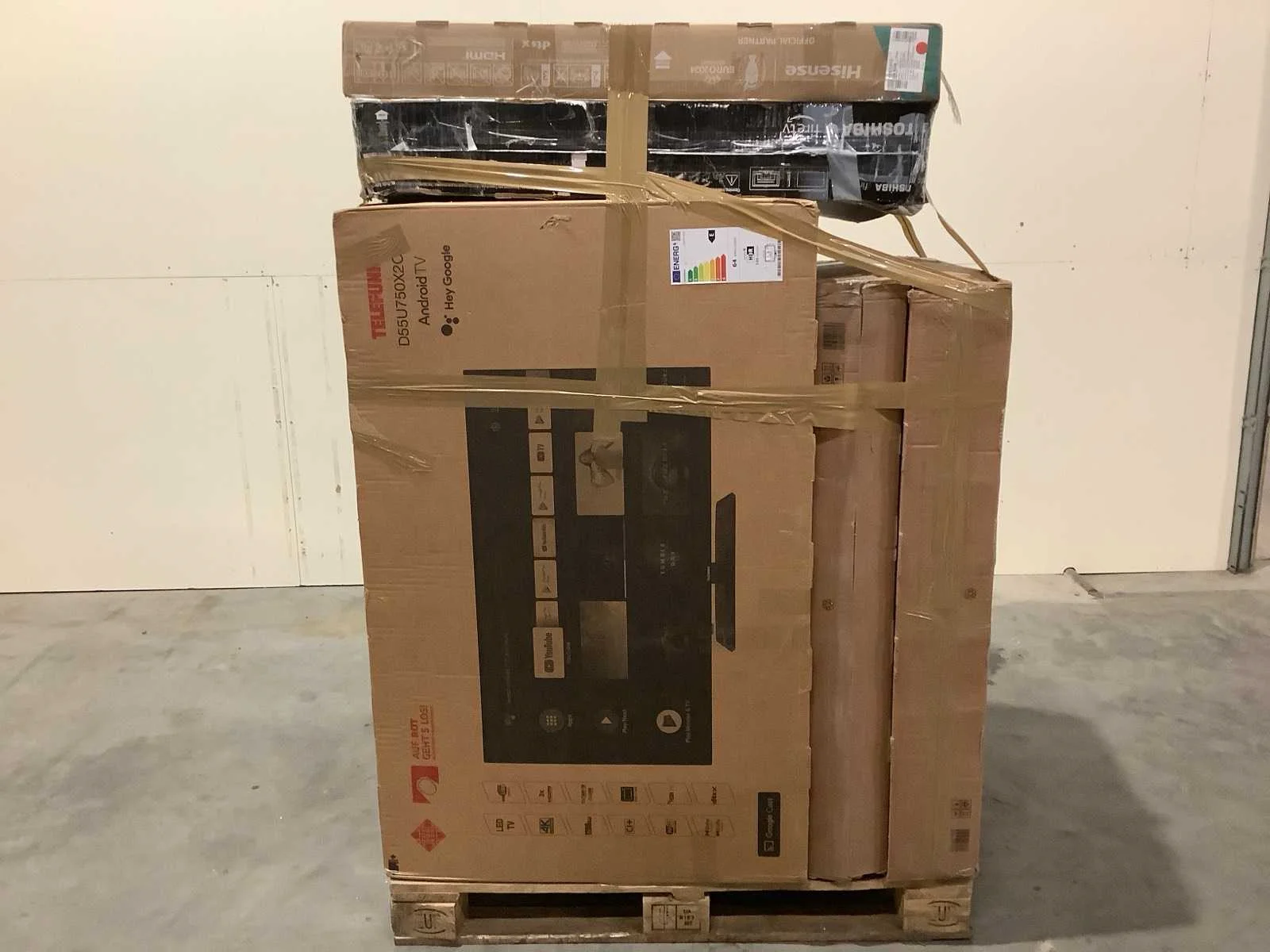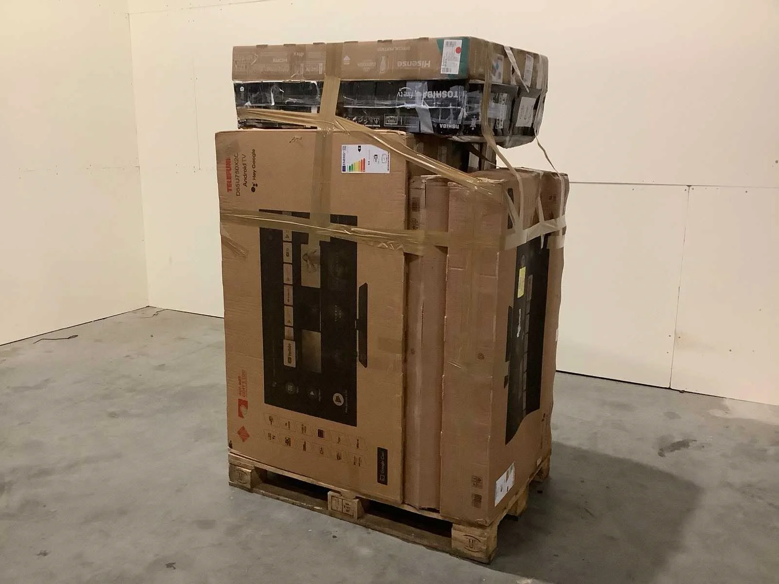 Dit betreft een partij televisies retourgoederen van een grote online retailer. De partij bestaat uit diverse diverse maten televisies. Aantal stuks: 9. Retailwaarde: €2.698,- De televisies zijn niet werkend en zijn te gebruiken voor onderdelen. Kom op de kijkdag om te om zo een goed beeld te krijgen van de reden van retour. Zie foto's voor lijst met inhoud. Merk: Pallet