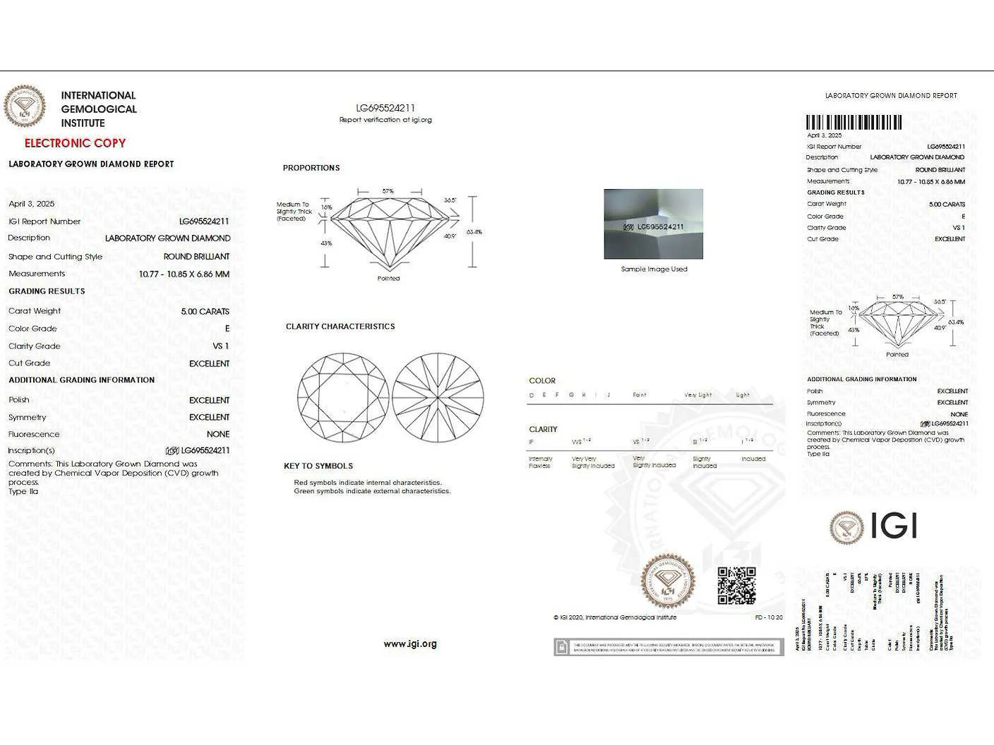 Ongebruikt Vorm: Rond Briljant Gewicht: 5,00 crt Kleur: E Duidelijkheid: VS1 Pools: Uitstekend Symmetrie: Uitstekend 18K wit goud Met IGI-certificaat Bezichtiging op afspraak Product type: 18 karaat wit goud Slijpvorm diamant: Rond Briljant Ringmaat: 54 Certificaat: International Gemological institute (IGI) Materiaal: 18 karaat wit goud Lage schatting: 10100€ Hoge schatting: 11900€
