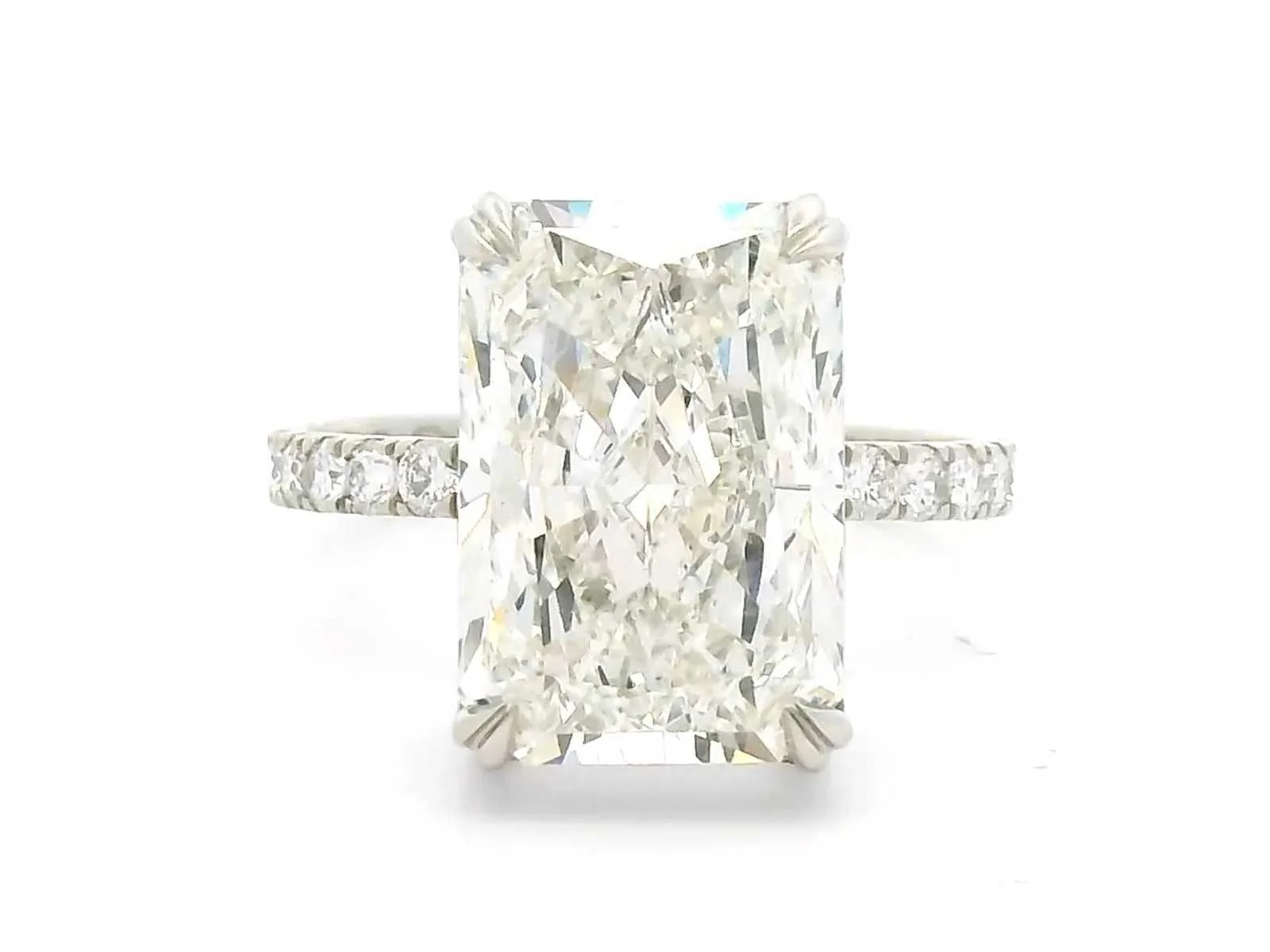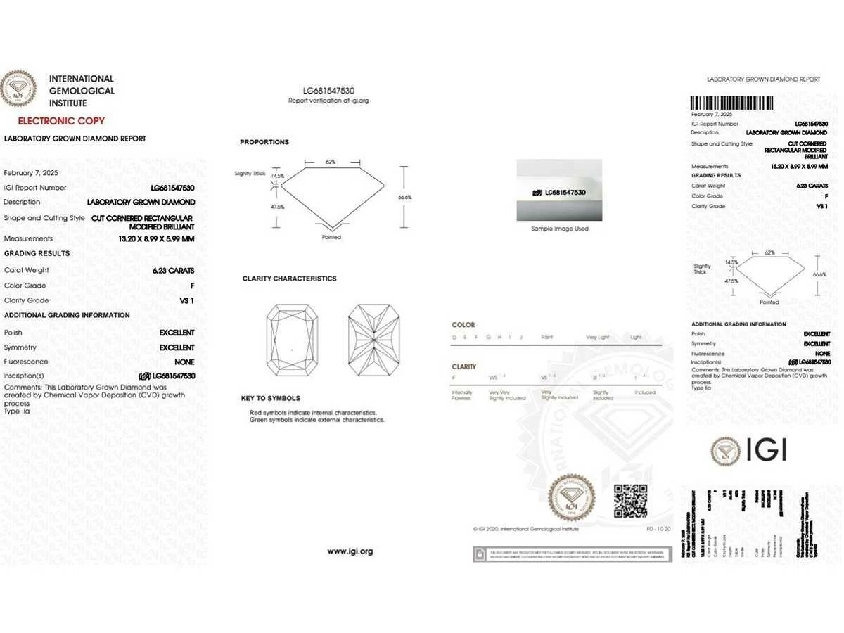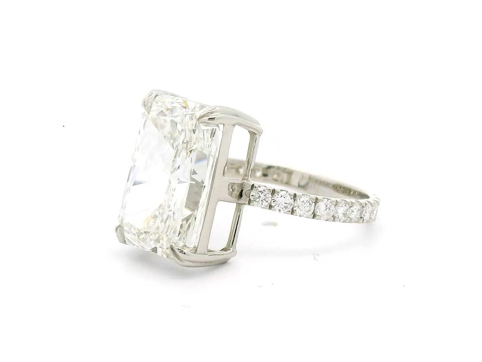 Totaal Carat Gewicht - 6,76 Gewicht van de hoofdsteen: 6,23 karaat Kleur: F Helderheid: VS1 Symmetrie: uitstekend Fluorescentie: Geen Omringende Steen - 0,53 (20 Stuks) Totaal gewicht van de ring: 4.130 gram Platina 950 Bezichtiging op afspraak Materiaal: Platina Maten: 54 Certificaat: Ja Lage schatting: 12900€