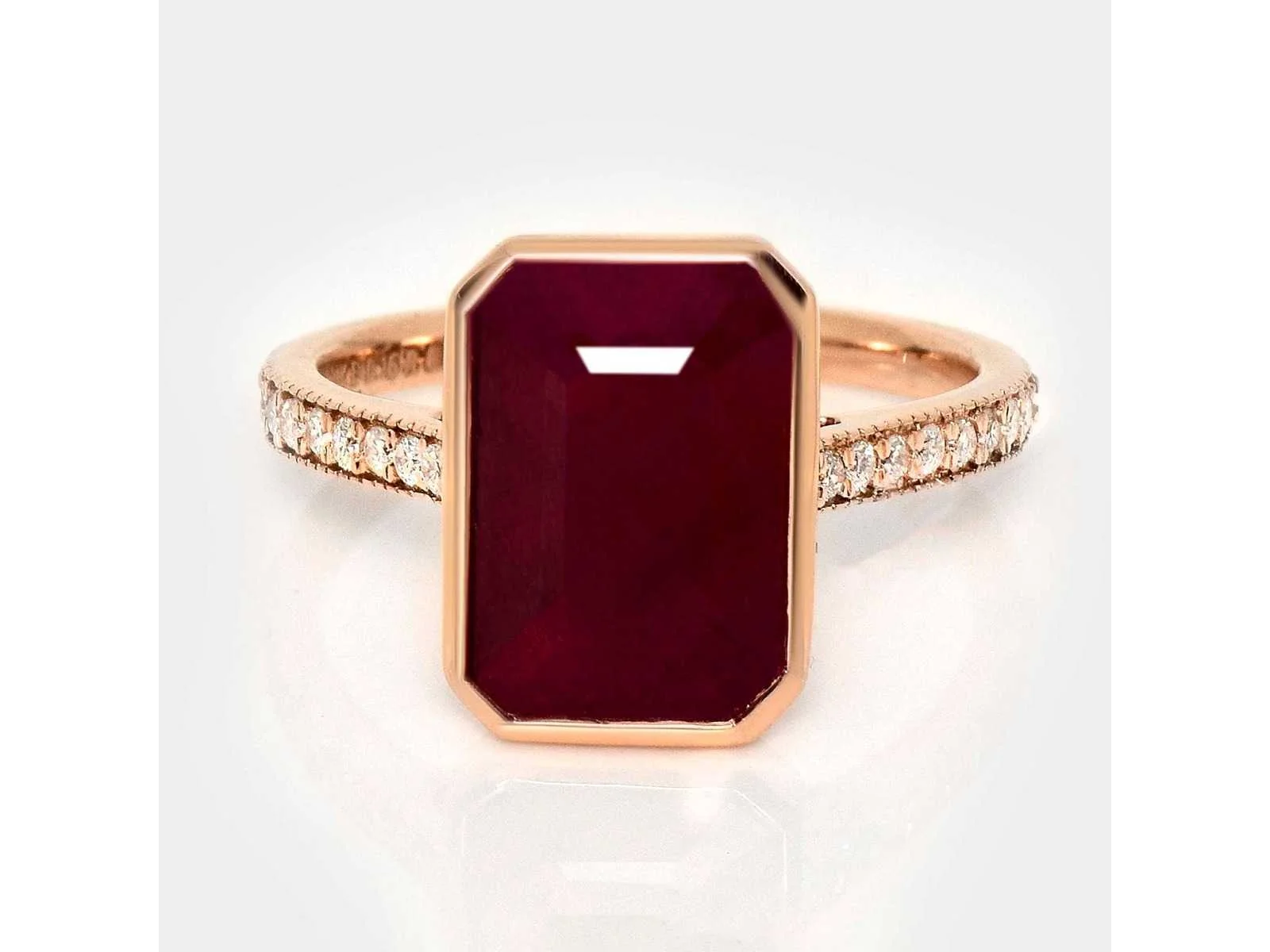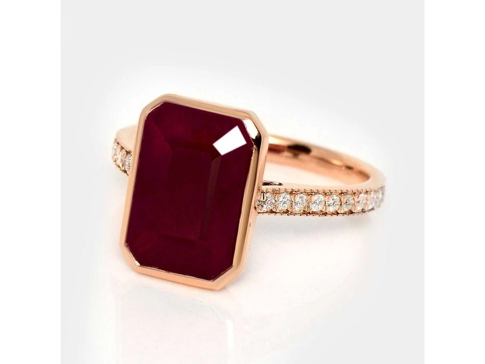 Main Stone Variety: Natural Ruby Shape: Emerald Cut Weight: 6.07 Carat Color: Purplish Red Transparency: Translucent Treatment: Unheated Certification No.: 40J7729925 Side Stone Variety: Diamond Shape: Round Brilliant Weight: 0.16 Carat Color: F-G Clarity: VS-SI Setting: Ring Metal: 14K Rose Gold Weight: 3.59 g Materiaal: Roségoud Ringmaat : 53 Certificaat: Ja
