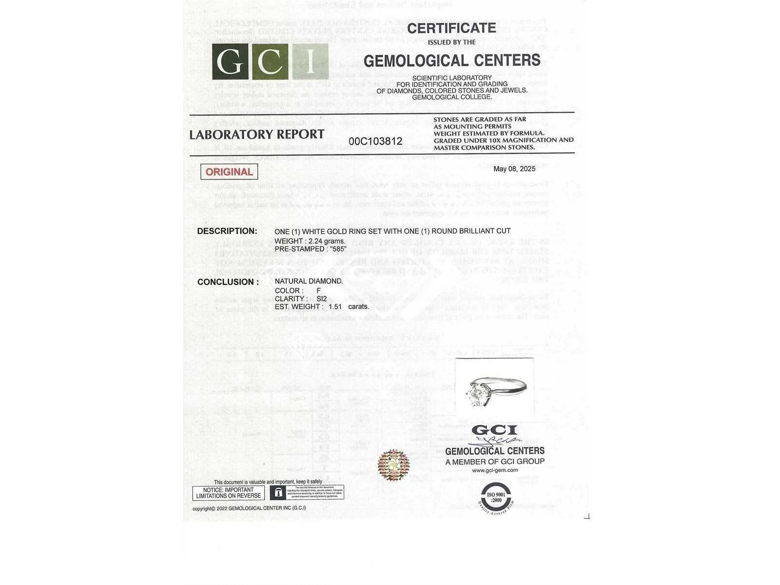Type middelste steen: natuurlijke diamant Vorm en snijstijl: Rond Brilliant Karaatgewicht: 1,51 ct Kleurgradatie F Helderheidsgraad SI2 Metaal: Wit Goud, 14K / 585 Sieradengewicht 2,24 g. Artikelnummer: 2411-42 VERSLAG NR. 103812 Bezichtiging op afspraak Materiaal: Wit goud Ringmaat : 57 Certificaat: ja Lage schatting: 13900€