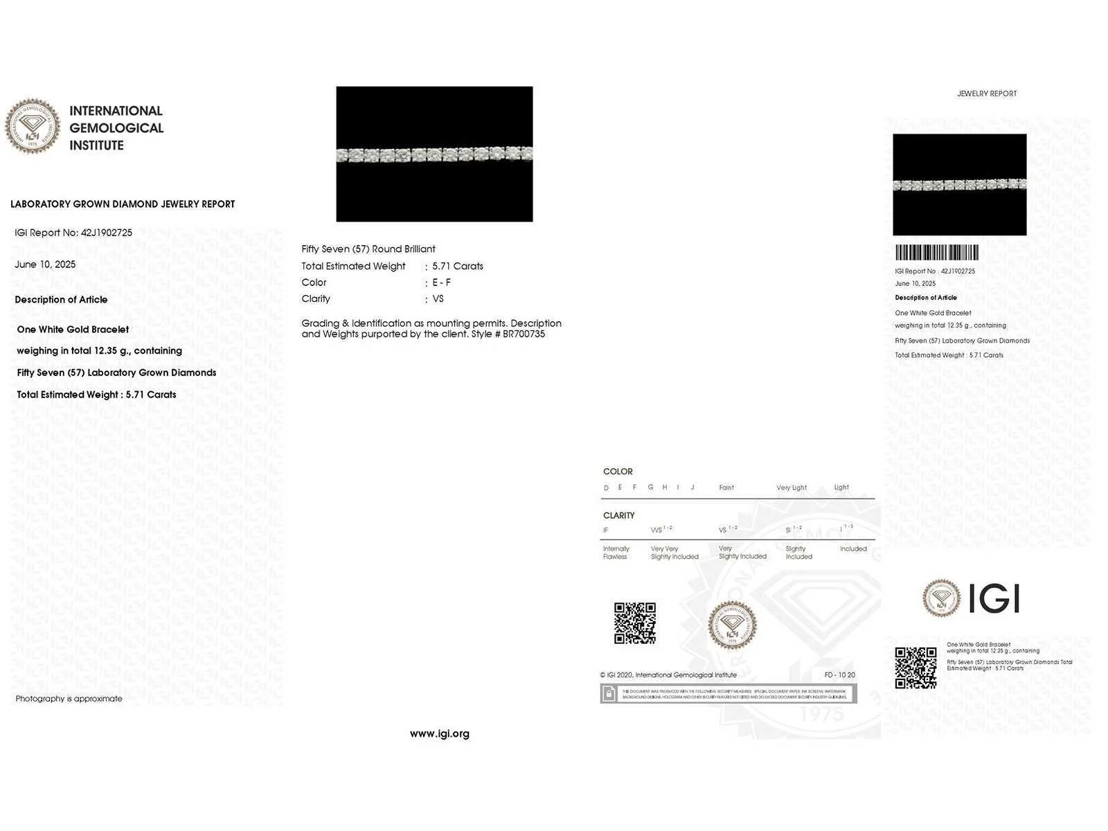 Metaal: 14 kt witgoud 11,21 g Diamanten: 57 stuks, briljantgeslepen, totaal 5,71 crt Kleur: E - F Helderheid: VS1 IGI-certificaat: 42J1902725 Lengte: 17,50 – 18,00 cm Bezichtiging op afspraak Materiaal: Witgoud Certificaat: ja Lage schatting: 15900€