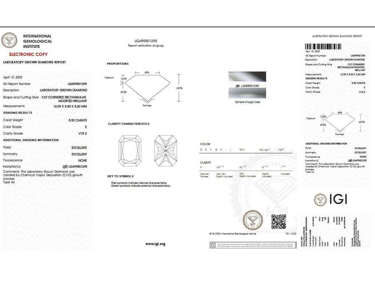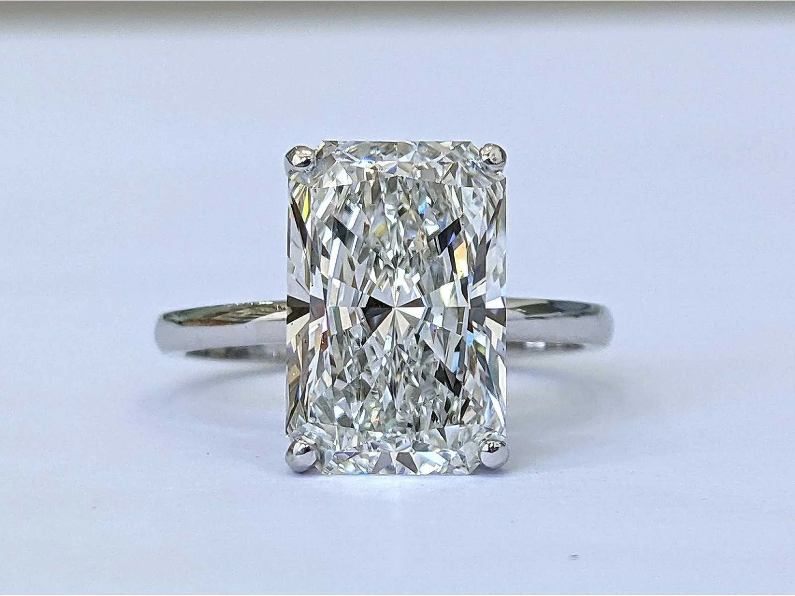 Ringmaat: 55 (EU) / 15 (IT) / 7 ¼ (VS) Carat: 5.00 carat Kleur: E Helderheid: VVS2 Vorm: rechthoek Bezichtiging op afspraak Materiaal: Witgoud Ringmaat : 55 Certificaat: ja Lage schatting: 11400€