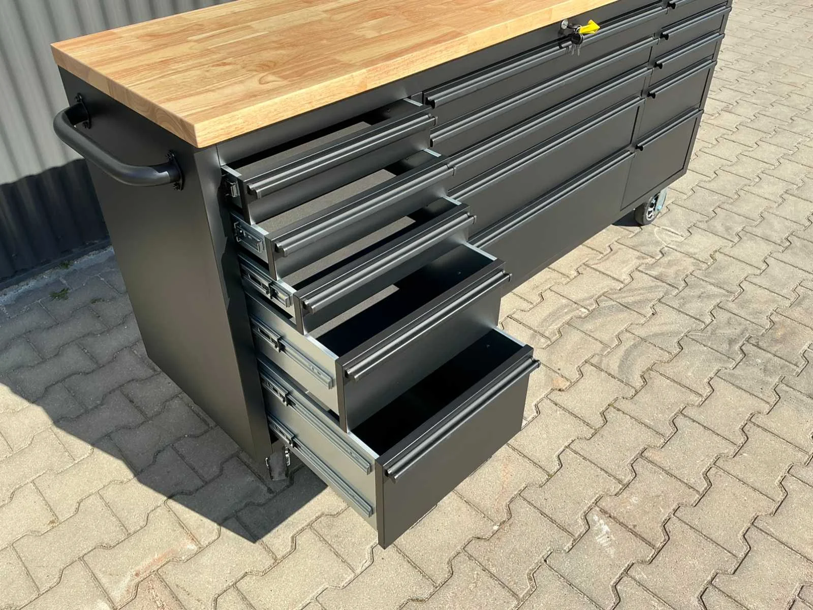 Breedte 180 cm Voorzien van poedercoating, luxe afgewerkt rubberhouten werkblad, 15 laden, 4 zwenkwielen (2 voorzien van rem), ongebruikt in doos. Merk: Field Type: 7215 Black Premium Bouwjaar: 2025