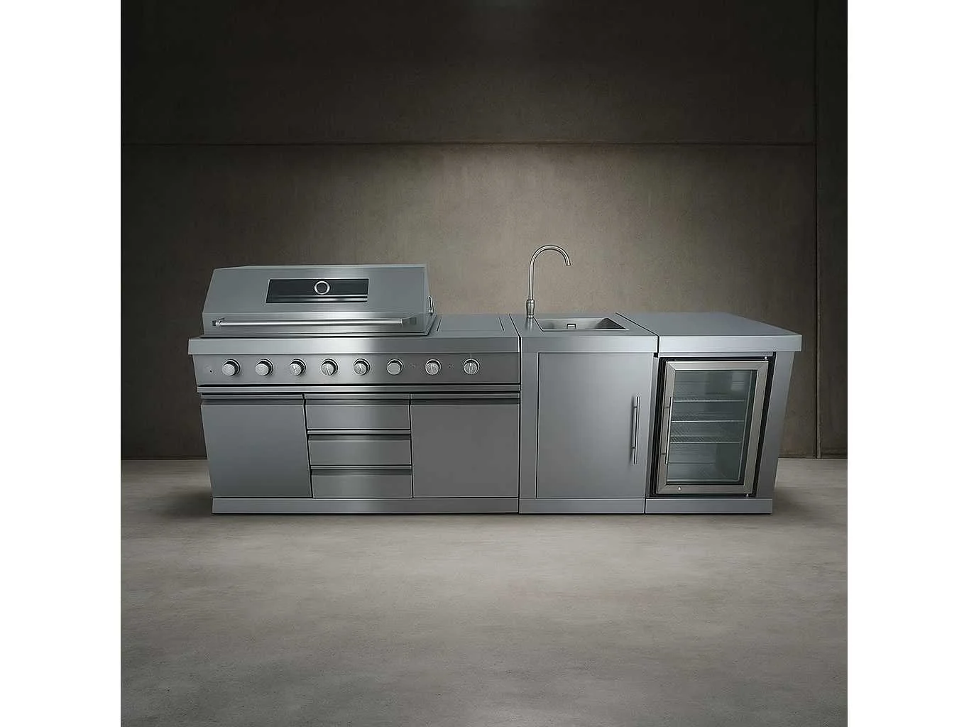 Modulair systeem, bestaande uit: RVS roestvrijstalen barbecue/grill, koelkast, spoelbak + keukenkraan, diverse kast- en opbergruimte. Merk: Field Outdoor Model: De Luxe Stainless Product type: #2 Lengte: 59cm Breedte: 262cm Hoogte: 121cm Materiaal: RVS