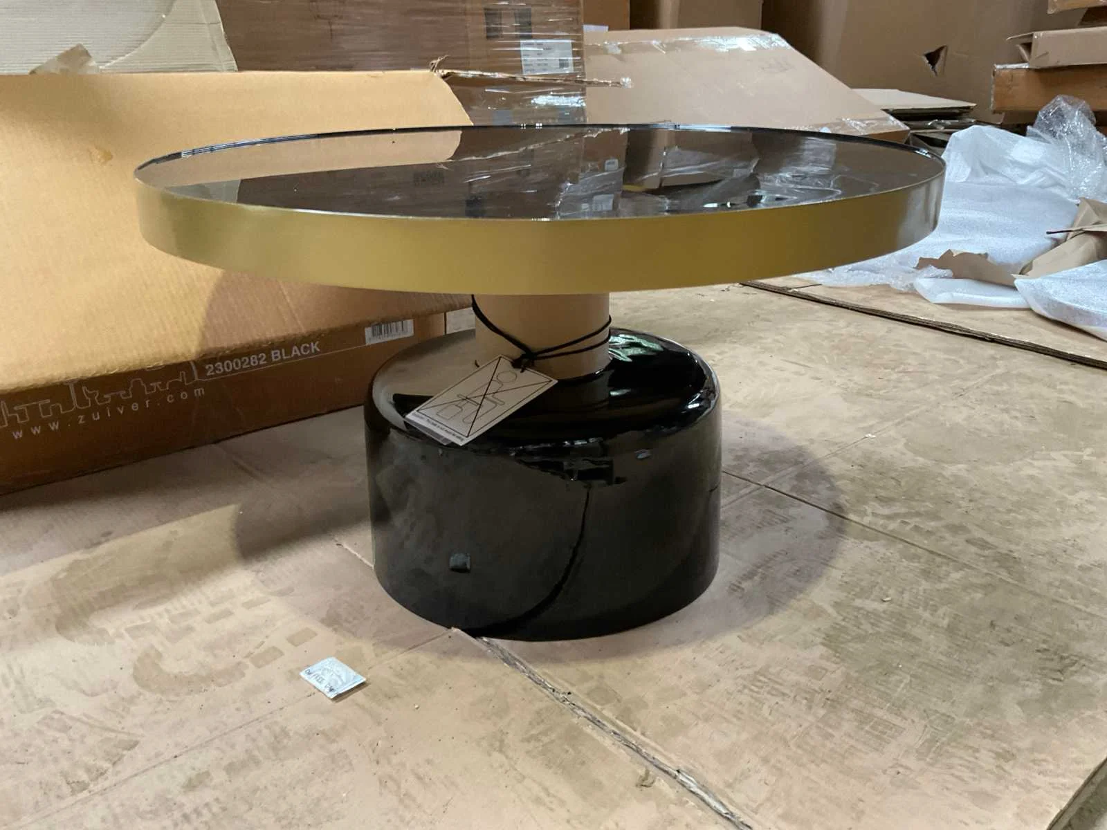 Dit betreft een retour product. Merk: Zuiver Model: Glam Vorm: Rond Kleur: Zwart/goud Gewicht: 9kg Lengte: 60cm Breedte: 60cm Hoogte: 35cm Materiaal: Ijzer, staal