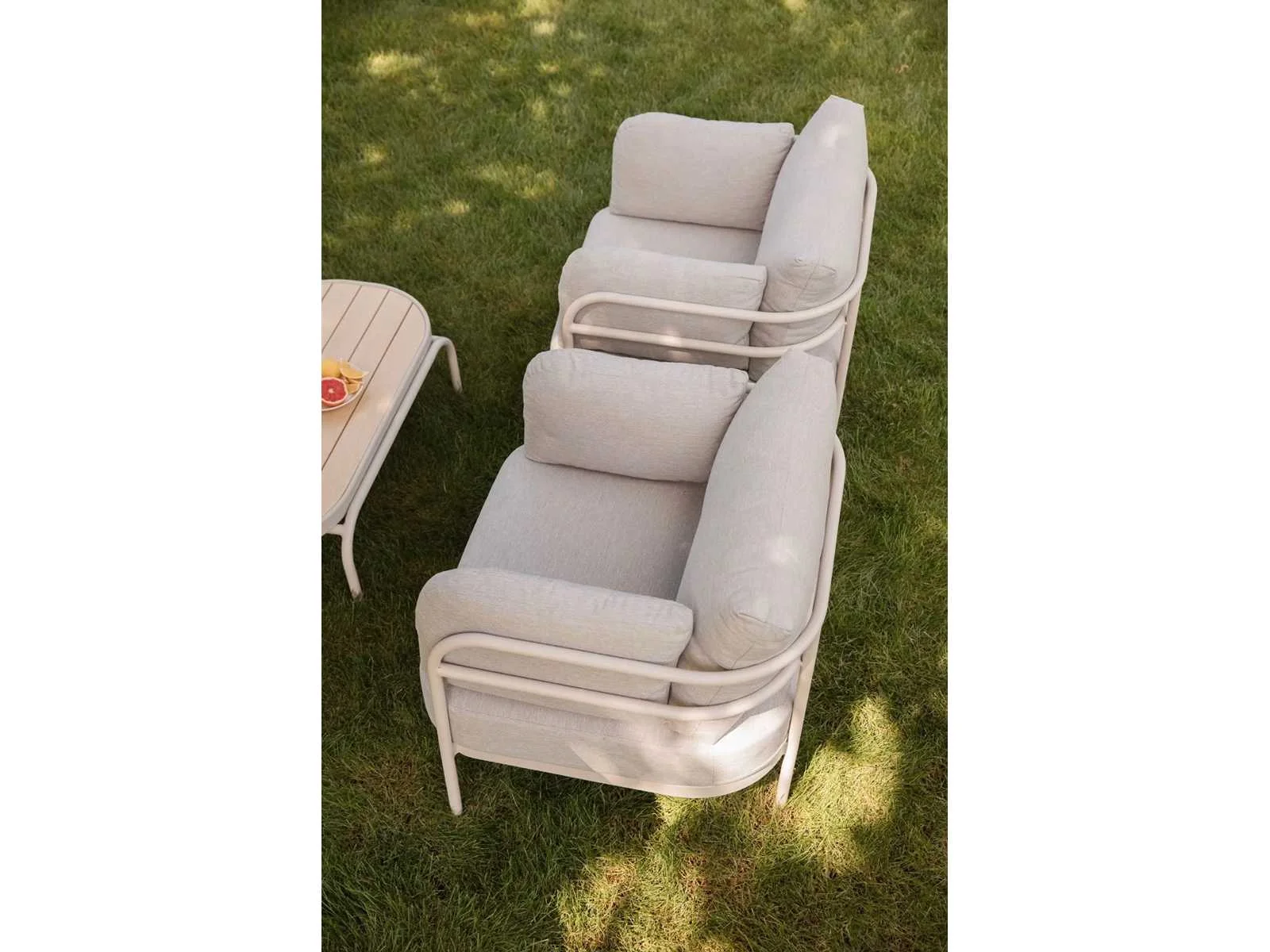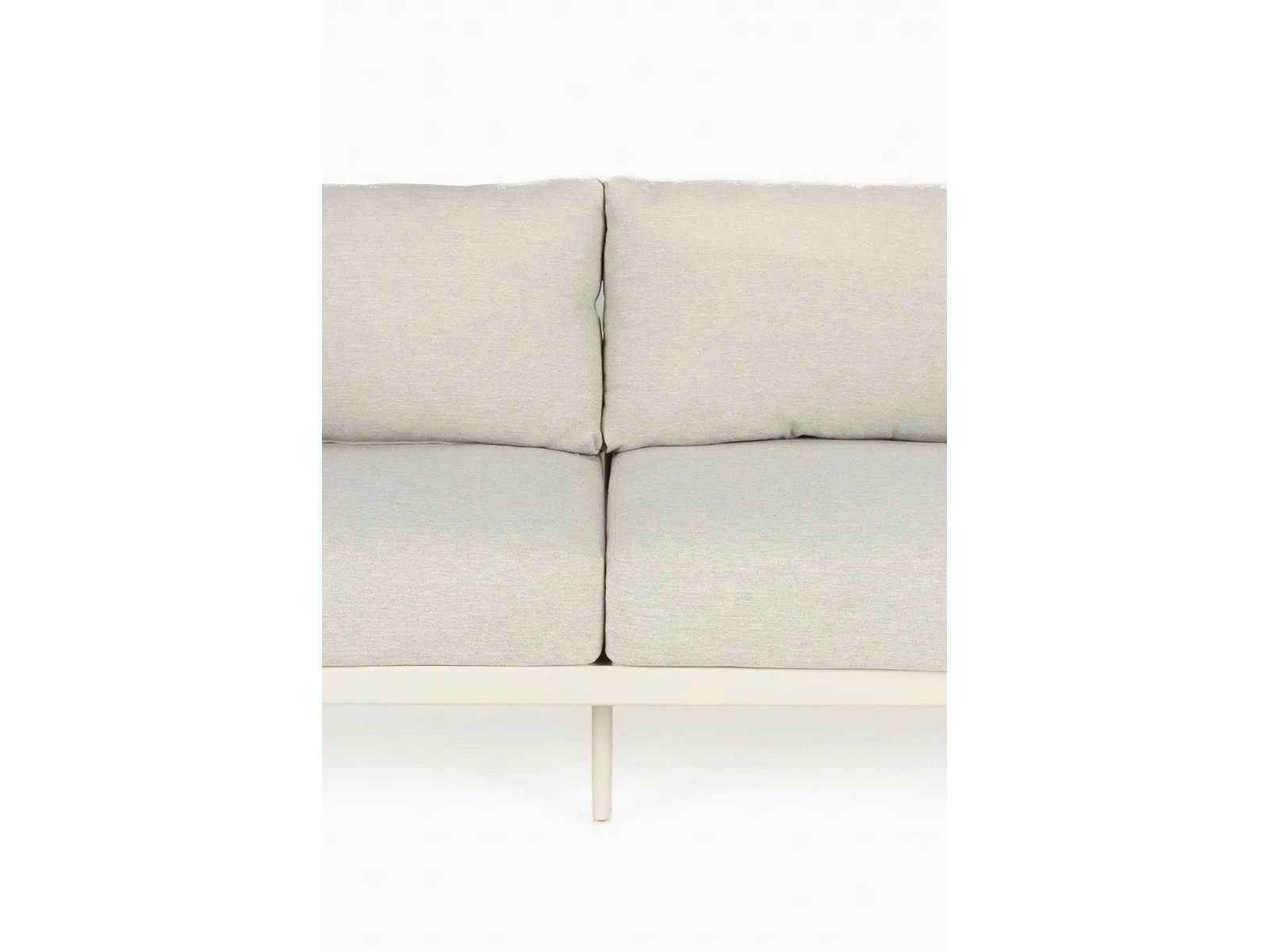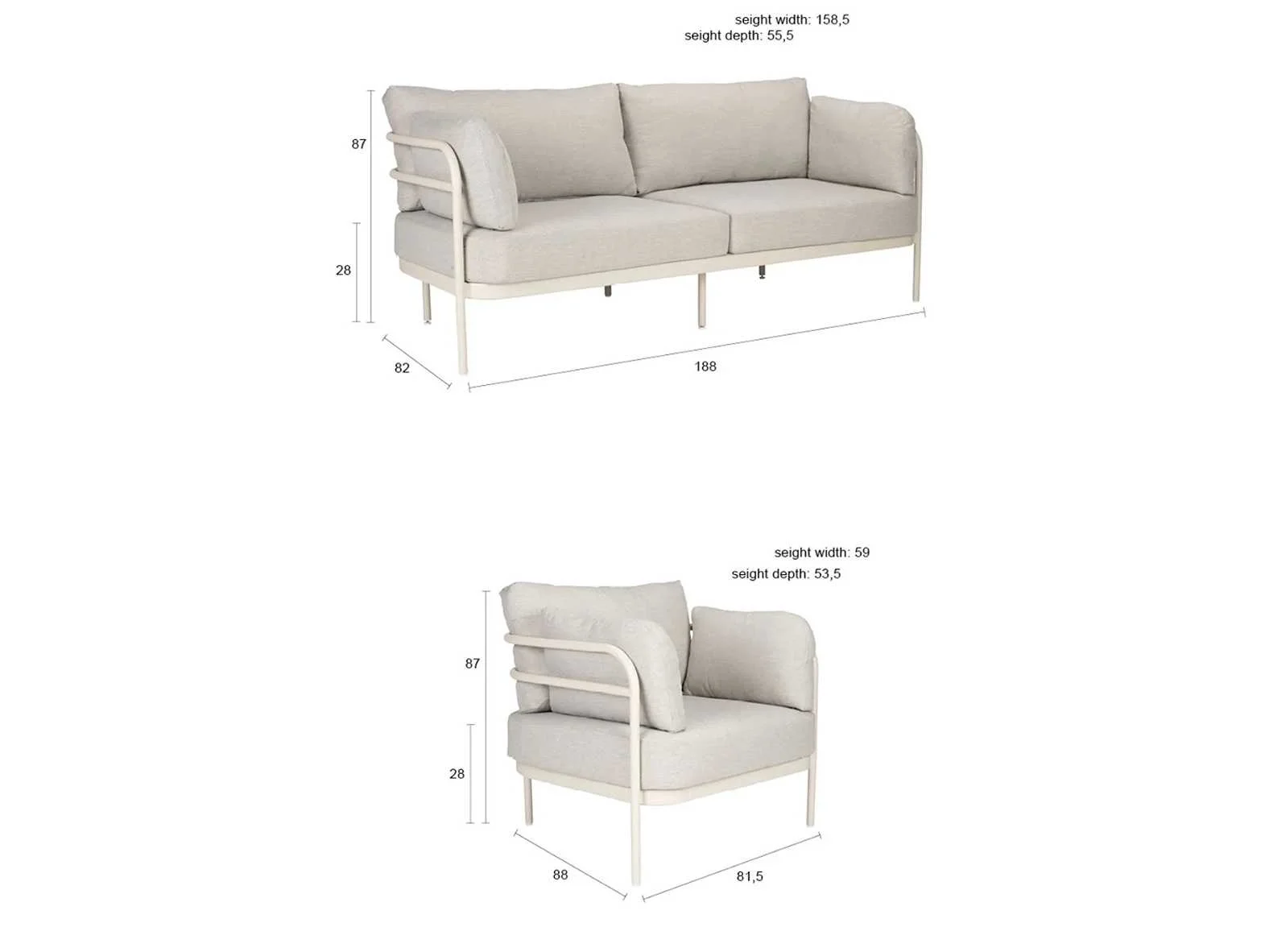 Gemaakt van sterk aluminium met poedercoating in een frisse tint. Voorzien van comfortabele zitkussens, bekleed met waterafstotende olefin stof. Dit betreft een retour product. Merk: Zuiver Model: Vista Kussens: true Stoelen: 2 Kleur: Beige Gewicht: 46.5kg Breedte: 188cm Hoogte: 87cm Materiaal: sterk aluminium met poedercoating Diepte: 55.5 Zithoogte: 28