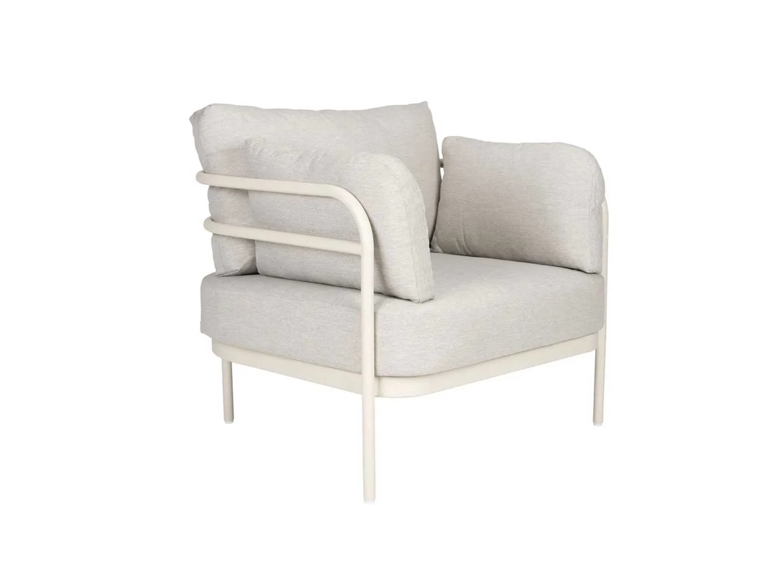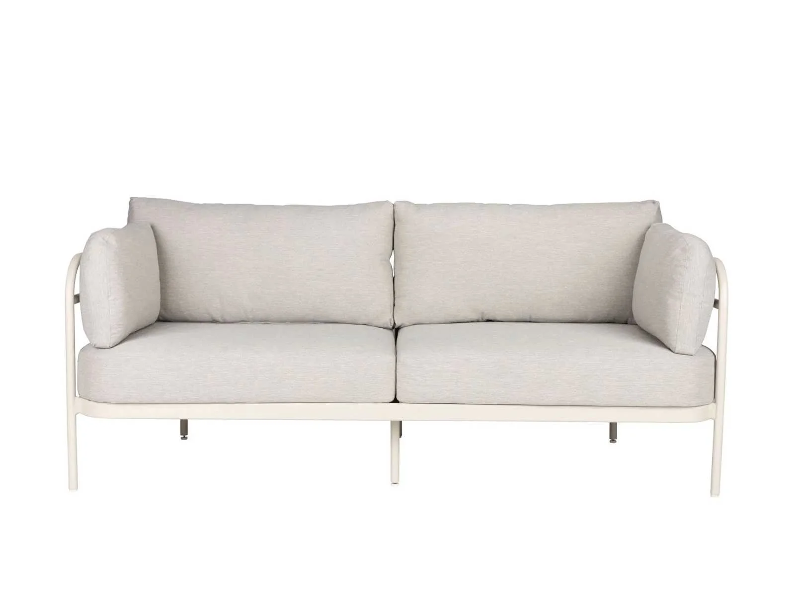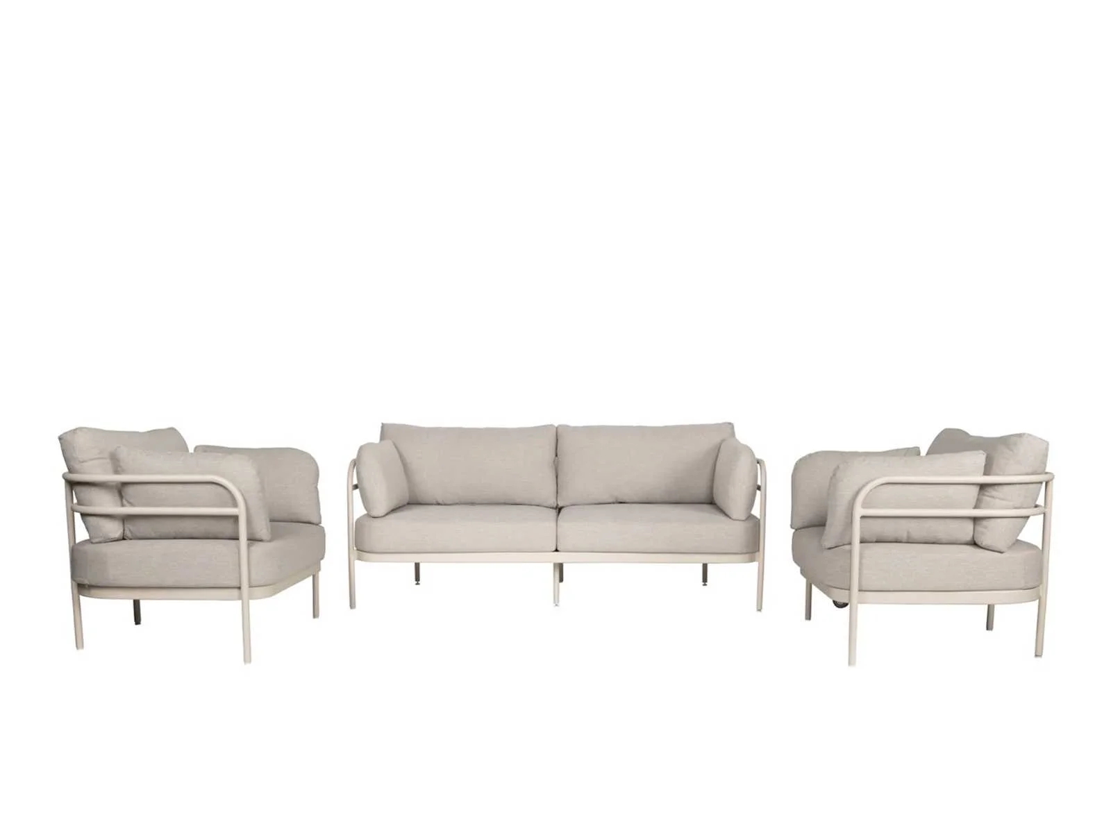 Gemaakt van sterk aluminium met poedercoating in een frisse tint. Voorzien van comfortabele zitkussens, bekleed met waterafstotende olefin stof. Dit betreft een retour product. Merk: Zuiver Model: Vista Kussens: true Stoelen: 2 Kleur: Beige Gewicht: 46.5kg Breedte: 188cm Hoogte: 87cm Materiaal: sterk aluminium met poedercoating Diepte: 55.5 Zithoogte: 28