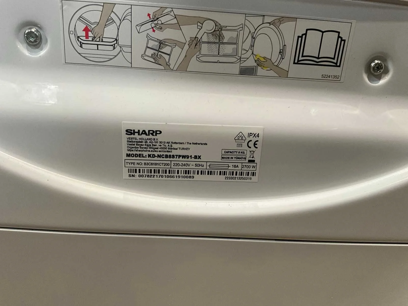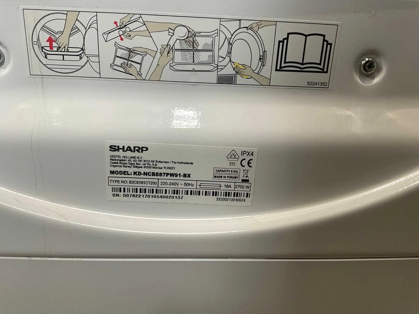 Dit betreffen retourgoederen. Merk: Sharp Model: KD-NCB8S7PW91-BX Spanning: 230V Volume: 65dB Energielabel: B Kleur: Wit Gewicht: 36.5kg Lengte: 60cm Breedte: 60cm Hoogte: 85cm Laadvermogen: 8kg