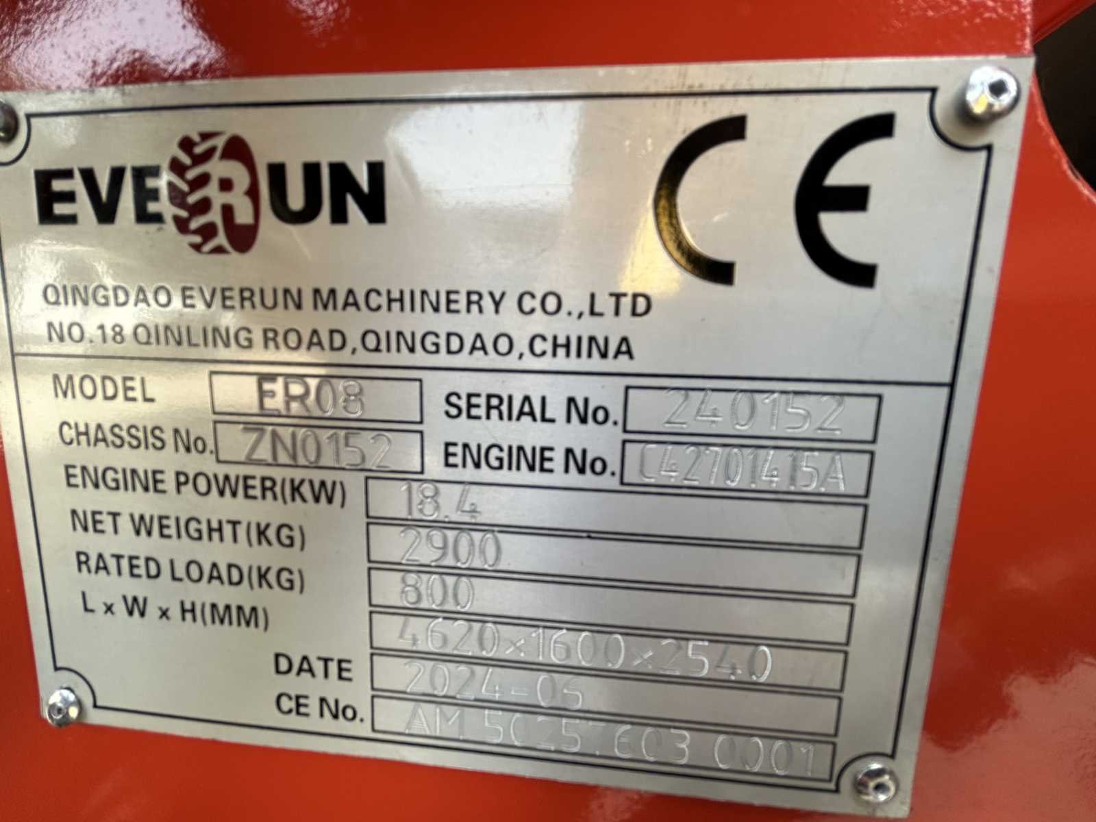 Ongebruikt; 2400r/min; dumping height ca. 2100mm; dumping reach 735mm; lifting height 3270mm lifting distance 1360mm; service brake mechanical, drum brake; parking brake manual disk brake; omschrijving: v.v. graafbak; vorkenbord; verwarming; ventilator; radio; achteruitrijcamera; geveerde stoel; 4wd; joystickbesturing; lepellengte 1070mm; Easy-to-open engine hood; 4453 Merk: Everun Type: ER08 Bouwjaar: 2025 Merk motor: changai 390 Motorvermogen (kW): 18.40kW Aantal cilinders: 3 Brandstof: diesel Bedrijfsgewicht: 800kg Graafbak afm. l: 1620mm Graafbak afm. b: 880mm Graafbak afm. h: 550mm Bandenmaat: 31x15.5-15nhs Cabine: true Afgelezen urenstand: 1 Eigen gewicht: 2900kg Totale afmeting L: 4620mm Totale afmeting Breedte: 1600mm Totale afmeting Hoogte: 2540mm