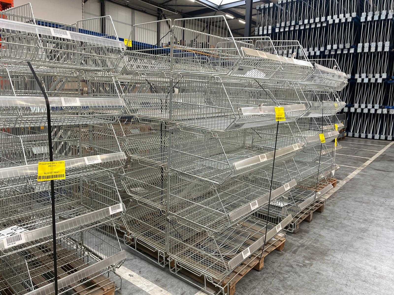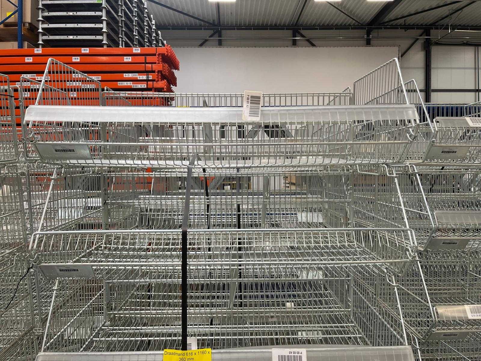 Draadmanden zijn stapelbaar; staal; let op; tussenschotjes kunnen ontbreken bij draadmand; er staan 10 draadmanden op 1 pallet; 8000 Totale afmeting L: 615mm Totale afmeting Breedte: 1160mm Totale afmeting Hoogte: 360mm