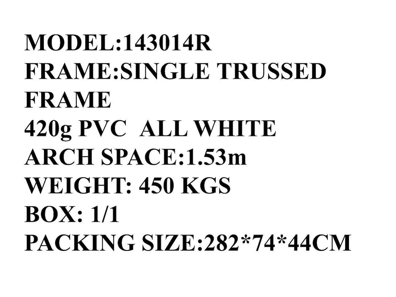 Voorzien van opslagtent / opslag shelter; singel trussen-/buizensysteem; gegalvaniseerd; beide uiteinden een deur; materiaal 420 gram PVC cover; kleur wit; inclusief montage handleiding; ongebruikt in metalen kist (transport afmetingen 282x74x44 cm) (let op af te halen vanaf circa 12 juni) Merk: Rhino-Cross-Shelter Type: 143014R - 9,2x4,3x4,3 m Bouwjaar: 2025 Eigen gewicht: 450kg Totale afmeting L: 9200mm Totale afmeting Breedte: 4300mm Totale afmeting Hoogte: 4300mm