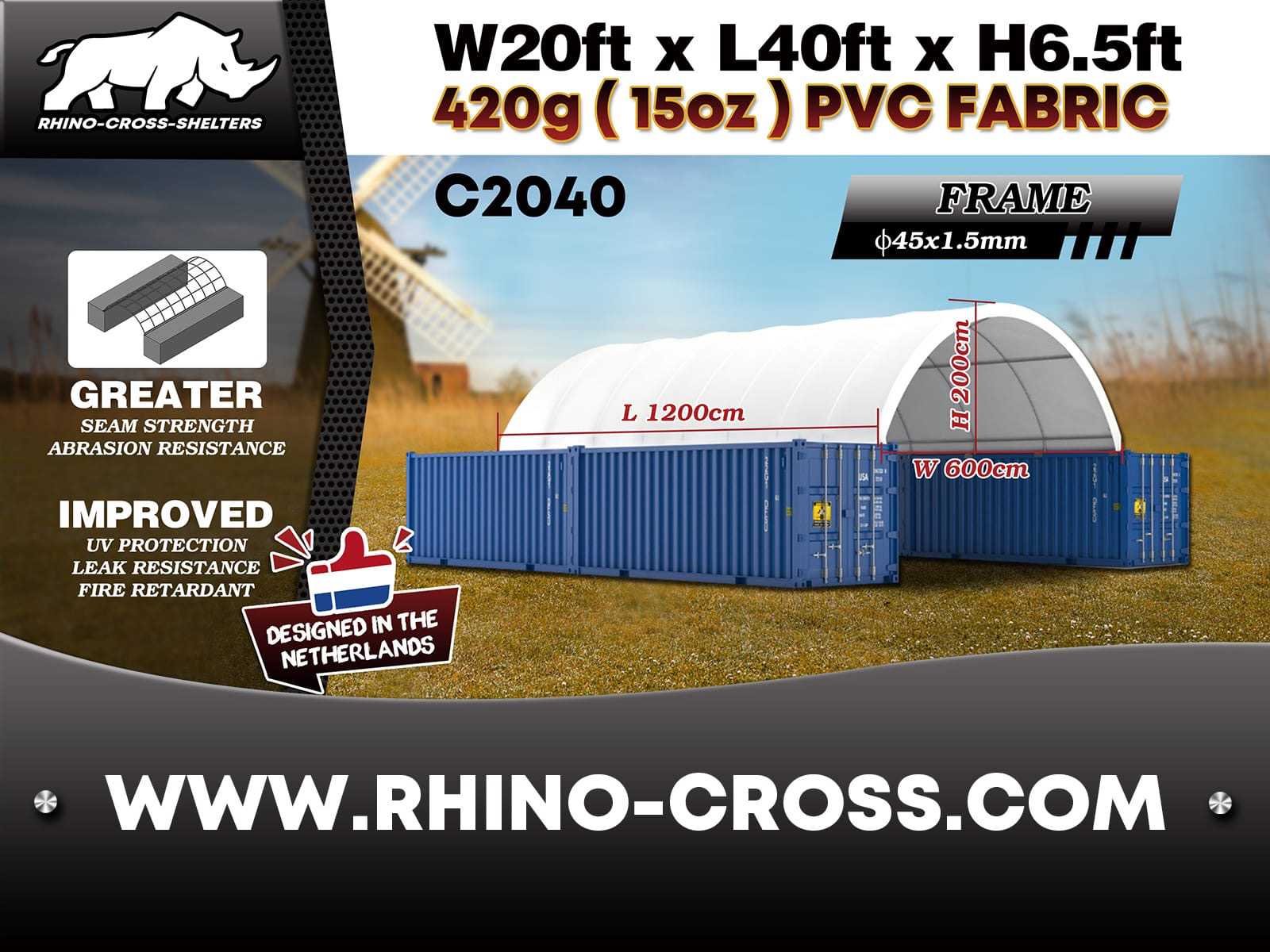 Voorzien van opslagtent / opslag shelter; singel trussen-/buizensysteem; gegalvaniseerd; beide uiteinden een deur; materiaal 420 gram PVC cover; kleur wit; inclusief montage handleiding; ongebruikt in metalen kist (transport afmetingen 192x75x45 cm) Merk: Rhino-Cross-Shelter Type: C2040 - 12x6x2 m Bouwjaar: 2025 Eigen gewicht: 360kg Totale afmeting L: 12000mm Totale afmeting Breedte: 6000mm Totale afmeting Hoogte: 2000mm