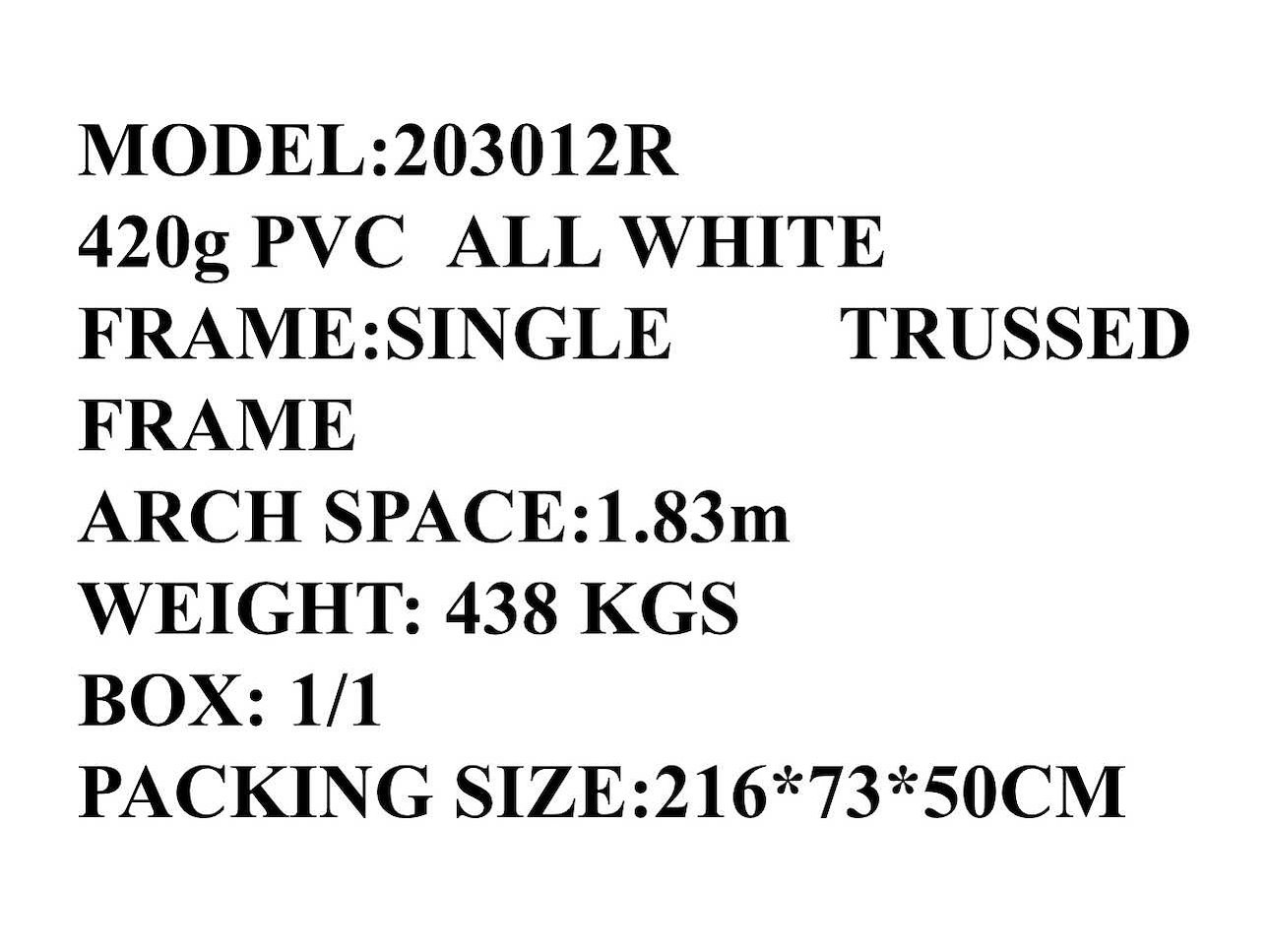 Voorzien van opslagtent / opslag shelter; singel trussen-/buizensysteem; gegalvaniseerd; beide uiteinden een deur; materiaal 420 gram PVC cover; kleur wit; inclusief montage handleiding; ongebruikt in metalen kist (transport afmetingen 216x73x50 cm) Merk: Rhino-Cross-Shelter Type: 203012R - 9,15x6,1x3,66 m Bouwjaar: 2025 Eigen gewicht: 438kg Totale afmeting L: 9150mm Totale afmeting Breedte: 6100mm Totale afmeting Hoogte: 3660mm