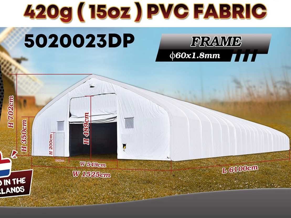 Voorzien van opslagtent / opslag shelter; dubbel trussen-/buizensysteem; gegalvaniseerd; beide uiteinden een deur; materiaal 420 gram PVC cover; kleur wit; inclusief montage handleiding; ongebruikt in metalen kist (transport afmetingen cm) Merk: Rhino-Cross-Shelter Type: 5020023DP - 61x15,25x7,015 m Bouwjaar: 2025 Totale afmeting L: 61000mm Totale afmeting Breedte: 15250mm Totale afmeting Hoogte: 7015mm