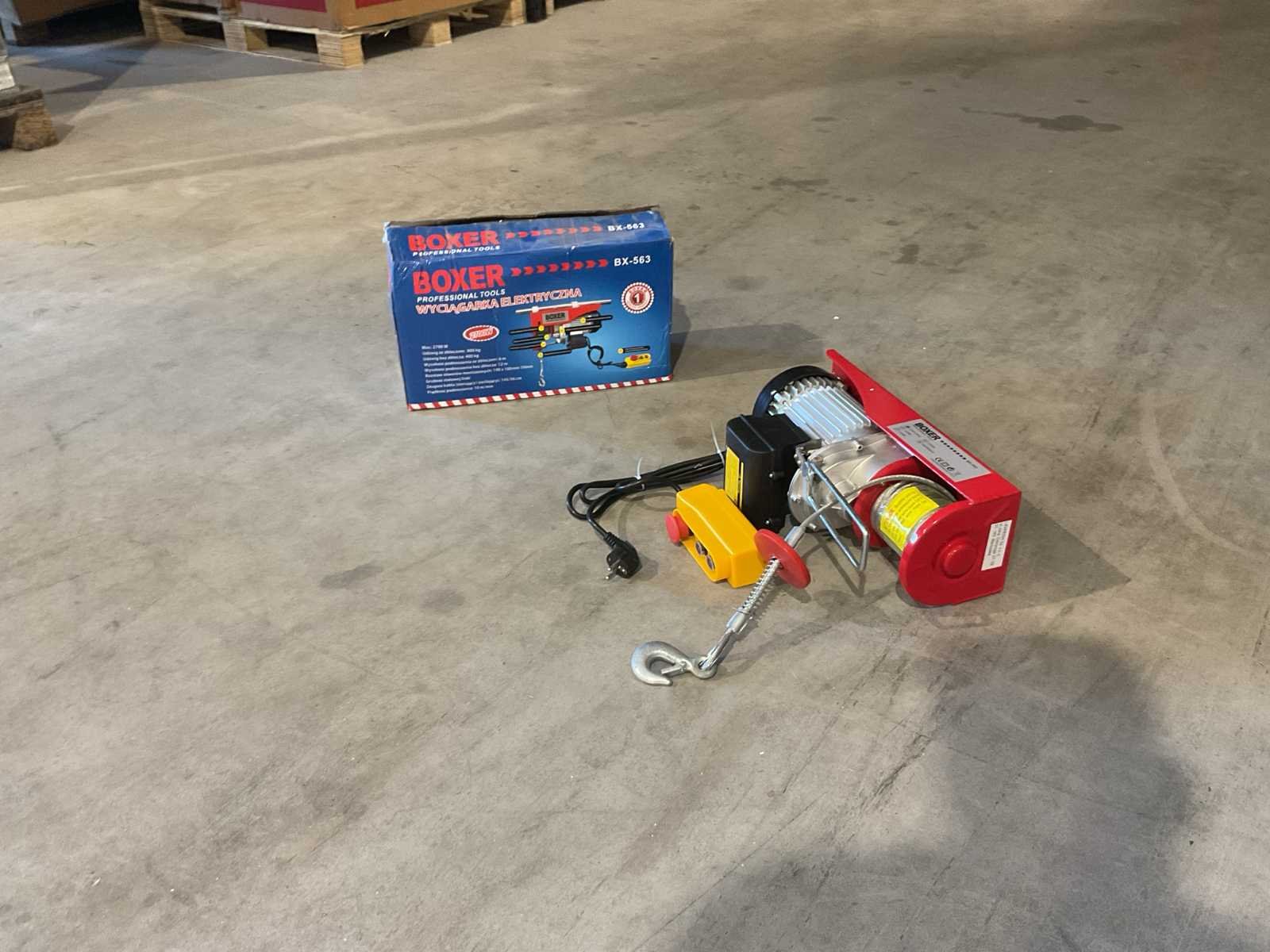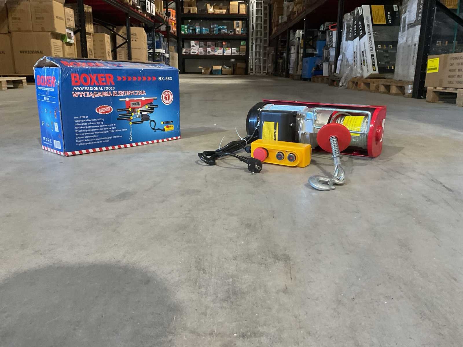 Voorzien van katrol; Motorvermogen: 2700 W; Maximale Laadcapaciteit (enkel / dubbel-kabel): ca. 400kg / 800kg; Maximale Hefhoogte (400kg / 800kg): 12m / 6m; Gem. hijssnelheid: 10 m/min;Aansluiting: 230V; 1 x elektrische lier; 1 x katrol met haak; 1 x montagebeugels; 1 x Bekabelde afstandbediening 1,45; Ongebruikt in doos (Afmeting transport verpakking 430x190x260 mm lxbxh, gewicht 18.30 kg) Merk: Boxer Type: BX-563 800kg Bouwjaar: 2025 Capaciteit.: 800kg Hijshoogte: 12m Afstandsbediening: true Aansluiting: 220V Totale afmeting L: 430mm Totale afmeting Breedte: 190mm Totale afmeting Hoogte: 260mm Eigen gewicht: 18.3kg