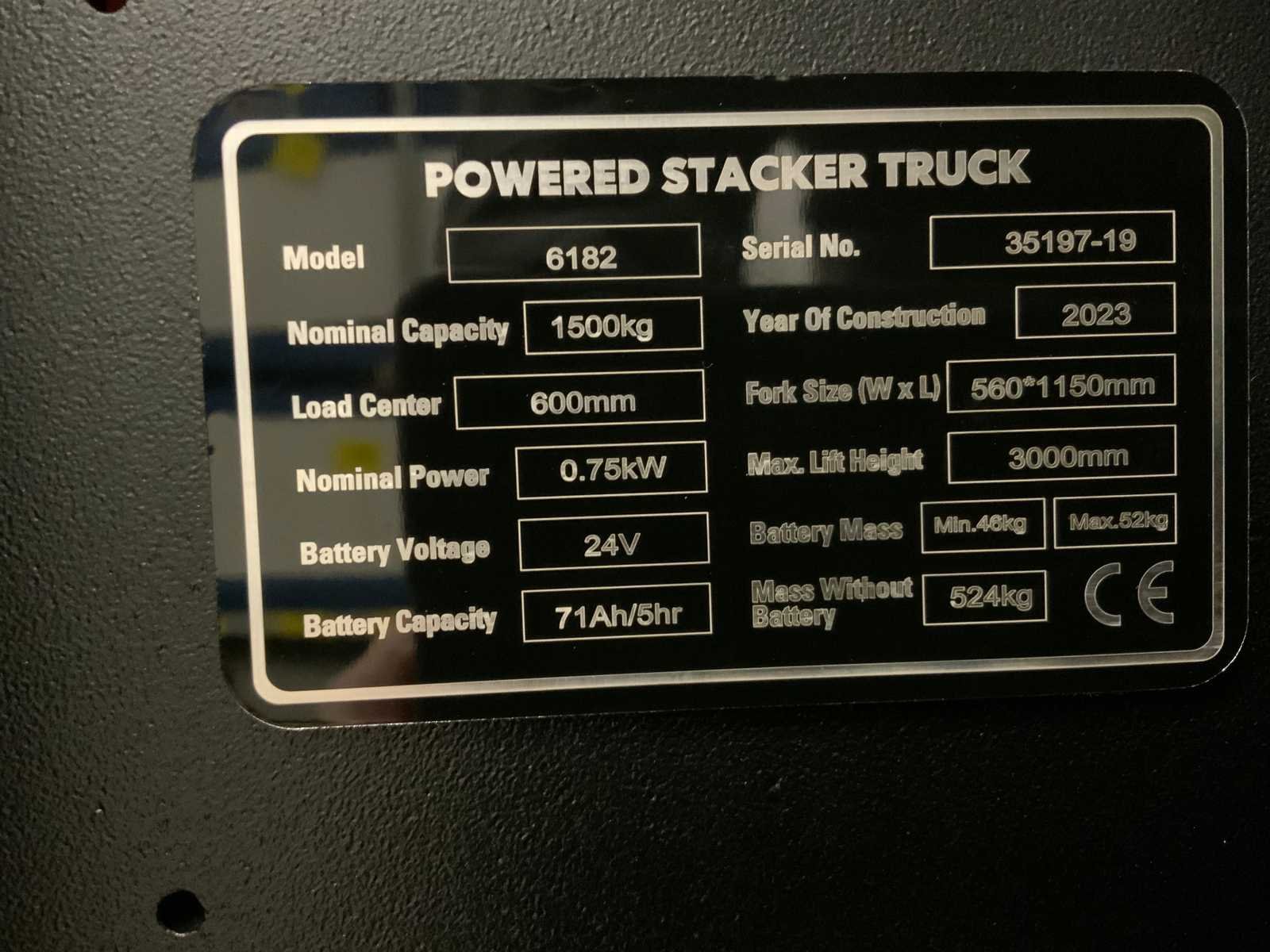 Fork size; 560x1150mm; loadcenter 600mm; power 0.75KW; battery voltage 24V; battery 71Ah-5hr; 230V; interne lader; lifted masthoogte 3435mm; turning radius 1490mm; noodstop; batterij percentage; dubbele ketting; noodknop; 6182 Merk: RTE Type: 6182 Bouwjaar: 2024 Hefvermogen: 1500kg Hefhoogte: 3000mm Lepellengte: 1150mm Eigen gewicht: 570kg Totale afmeting L: 1710mm Totale afmeting Breedte: 820mm Totale afmeting Hoogte: 1980mm