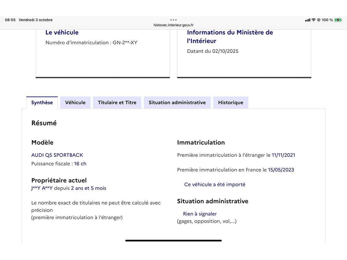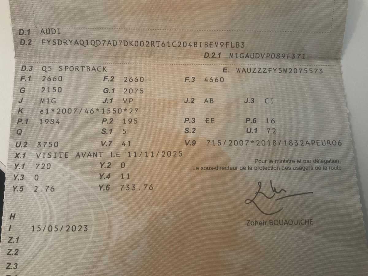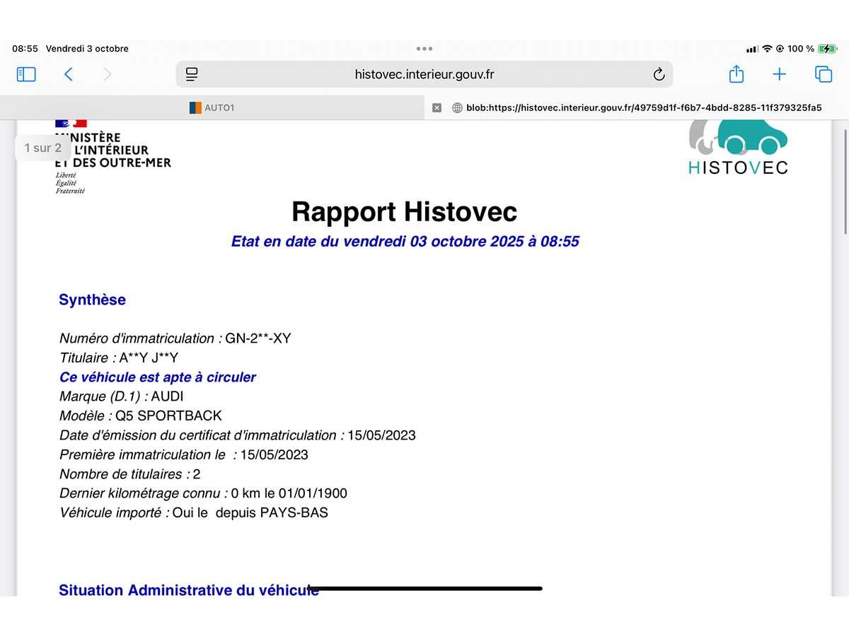 Merk: Audi Model: Q5 Type: Sportback 55 TFSIe quattro S line Bouwjaar: 2021 Afgelezen kilometerstand: 43654km Cilinderinhoud: 1984cc Vermogen (kW): 270kW Brandstof: Hybride Benzine Chassisnummer: WAUZZZFY5M2075573 Datum eerste toelating: 11-2021 APK vervaldatum: 11-2025 Vermogen (pk): 367hp Aandrijving: Start en rijdt Aantal zitplaatsen: 5 Kleur: Grijs Transmissie: Automaat Aantal deuren: 5 Aantal sleutels: 2 Aantal cilinders: 4 Carrosserie: SUV Nationaliteit documenten: Frankrijk CO2-uitstoot NEDC: 41 Start en rijdt: Start and drive startinformatie : Start en rijdt