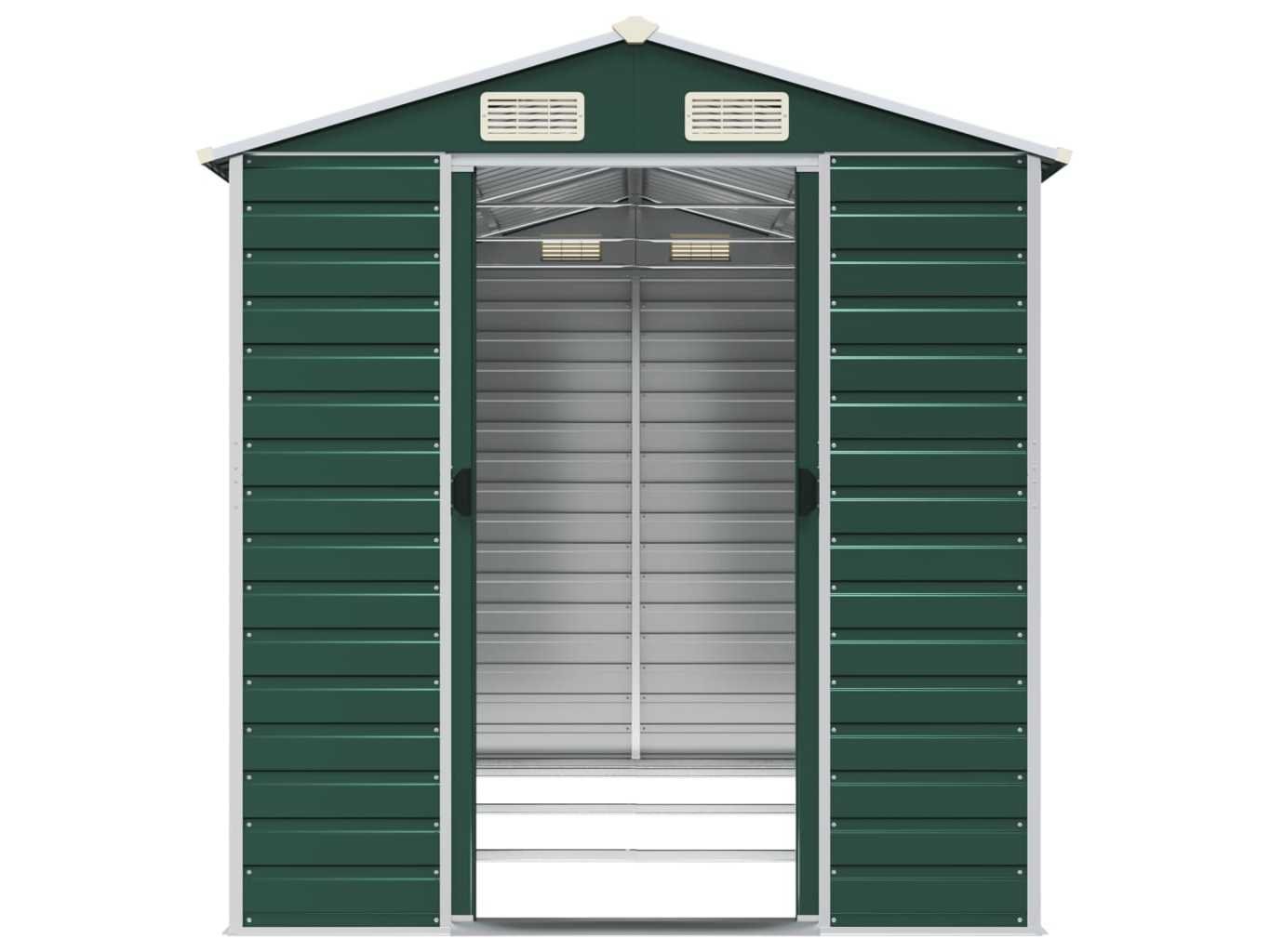Breid je tuinopbergmogelijkheden uit en bescherm je gereedschap met deze multifunctionele tuinschuur. Robuust materiaal: het tuinschuurtje is gemaakt van gegalvaniseerd staal, dat roestvorming voorkomt en lang meegaat. Staal is een buitengewoon hard en sterk materiaal. Het biedt stevigheid en stabiliteit. Galvanisatie biedt een betere bescherming tegen corrosie en is handig voor producten die buiten of in ruwe omgevingen worden gebruikt. Voldoende opbergruimte: deze metalen schuur biedt voldoende ruimte om je brandhout, tuingereedschap, meubels, uitrusting en meer in op te bergen. Handige handgrepen: de deur van de opbergschuur is voorzien van handgrepen voor gemakkelijke toegang. Goede ventilatie: de berging heeft 4 ventilatieopeningen die zorgen voor ventilatie, om de ophoping van vocht en geurtjes in de schuur te verminderen. Schuin ontwerp: dankzij het schuine dak loopt water er ongehinderd vanaf. Kenmerken Kleur: groen Materiaal: gegalvaniseerd staal Totale afmetingen: 191 x 300 x 198 cm (B x D x H) Afmetingen deur: 80 x 170 cm (B x H) Merk: vidaXL Model: zadeldak Product type: tuinhuis Kleur: donkergroen Gewicht: 120kg Lengte: 300cm Breedte: 191cm Hoogte: 198cm Materiaal: Verzinkt-gespoten staal