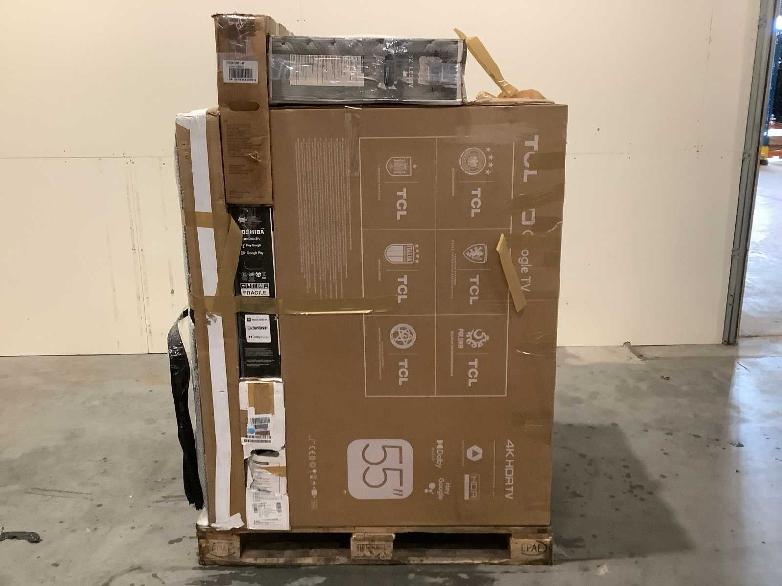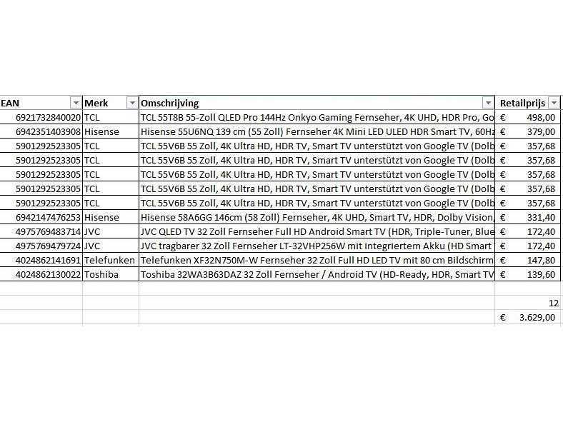 Dit betreft een partij televisies retourgoederen van een grote online retailer. De partij bestaat uit diverse diverse maten televisies. Aantal stuks: 12. Retailwaarde: €3.629,- De televisies zijn niet werkend en zijn te gebruiken voor onderdelen. Kom op de kijkdag om te om zo een goed beeld te krijgen van de reden van retour. Zie foto's voor lijst met inhoud. Merk: Pallet
