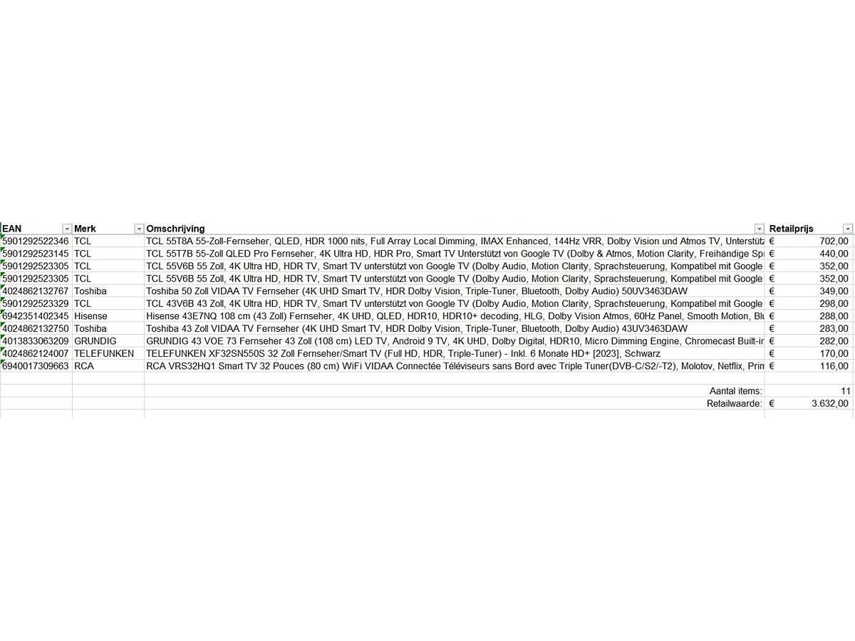 Dit betreft een partij televisies retourgoederen van een grote online retailer. De partij bestaat uit diverse diverse maten televisies. Aantal stuks: 11. Retailwaarde: €3632,- De televisies zijn niet werkend en zijn te gebruiken voor onderdelen. Kom op de kijkdag om te om zo een goed beeld te krijgen van de reden van retour. Zie foto's voor lijst met inhoud. Bezorgtermijn 14 dagen Merk: Pallet Retourgoederen