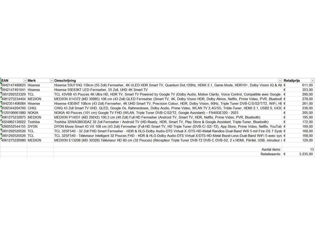 Dit betreft een partij televisies retourgoederen van een grote online retailer. De partij bestaat uit diverse diverse maten televisies. Aantal stuks: 13. Retailwaarde: €3235,- De televisies zijn niet werkend en zijn te gebruiken voor onderdelen. Kom op de kijkdag om te om zo een goed beeld te krijgen van de reden van retour. Zie foto's voor lijst met inhoud. Bezorgtermijn 14 dagen Merk: Pallet Retourgoederen
